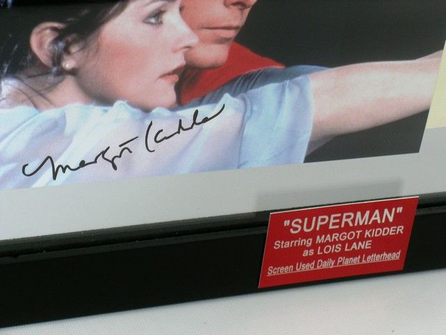 Who can ever forget the sexy and magical sequence when Superman (Christopher Reeve) lifts Lois Lane (Margot Kidder) off her high-rise apartment balcony and files her through the city by the light of the moon while the love theme "Can You Read My Mind" plays in the background? To commemorate one of the most romantic moments in movie history From "Superman" (1978), this is a beautifully framed display with a signed autograph photo by Ms. Kidder on a photo of her and Superman in mid-flight above the city. It also includes a rare actual piece of screen used Daily Planet stationary, where, of course Lois was a reporter. Also includes the official Superman Logo, as well as a custom plaque which reads: "SUPERMAN- STARRING MARGOT KIDDER AS LOIS LANE-SCREEN USED DAILY PLANET LETTERHEAD". Comes with a COA from Todd Mueller Autographs for the Margot Kidder signature, and a COA for the set of Daily Planet Screen used stationary from Prop Store. Frame is Approx. 22.5" x 18.5".