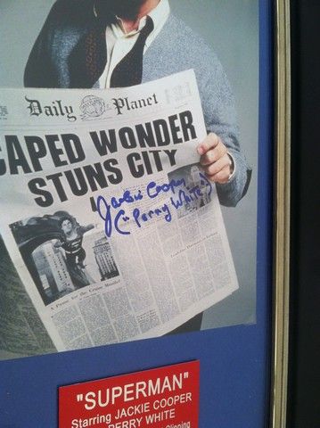 From what many believe to be the best of all the "Superman" reincarnations on the big screen, this is a unique collectable from the 1978 Christopher Reeve version. it begins with a rare autograph photo of the legendary actor Jackie Cooper in his role as the Editor-in-Chief of the Metropolis newspaper, the Daily Planet, as well as a screen used "buck sheet" from the Daily Planet newsroom set. Comes with a COA from Piece of the Past, Inc. for the autograph, and another COA from the Prop Shop for the stationary. Beautifully matted and framed. Frame is approx. 16" x 18"