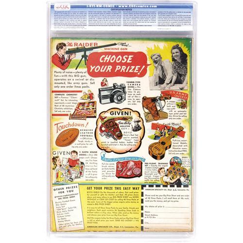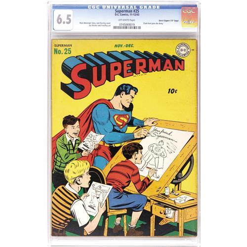 <B>Superman #25 Davis Crippen ("D" Copy) pedigree (DC, 1943) CGC FN+ 6.5 Off-white pages.</B></I> Fred Ray penciled a number of Superman <I>covers</B></I>, but this issue features the only complete superhero <I>story</B></I> he ever drew. The tale, scripted by Mort Weisinger, was reportedly written expressly for the U.S. Army as a bit of advertising. Clark Kent joins the army in the story to research an article he's writing for the Daily Planet. The issue's other artists include Jack Burnley (who drew the cover). There's also a tale drawn by Joe Shuster that has Superman rescuing a comic book artist and then chiding him for submitting substandard art that's drawn by his assistants! Someone at DC was making a statement, we suspect. Overstreet 2006 FN 6.0 value = $411; VF 8.0 value = $856. CGC census 6/06: 1 in 6.5, 12 higher. <I>From the Crippen Collection.</B></I> <BR><BR><B>Important notice:</B> Heritage usually auctions material at the rate of 200-250 lots per hour. On some occasions eBay Live bid software or the Internet may not be able to keep up with the pace of the auction. We recommend placing a realistic absentee bid now as insurance to avoid disappointment. Occasionally the auctioneer may eliminate or reject an eBay Live bid, and the auctioneer may also reopen a lot after the close of the eBay live bidding (usually because we missed an audience bid), and may reject your bid even if it shows you as the winning bidder. By bidding via eBay Live, you agree that Heritage may award the lot to another bidder at its sole discretion under the circumstances described above or any other reasonable circumstances. Since eBay bids are not shown to us until we open the lot on the floor, we treat those bids just like floor bids. In most cases the floor responds before the eBay bid is presented to us, due to Internet lag time, so for consistency we have made it a policy that floor bids are always considered first over tie eBay live bids. Also please note that all Heritage lots purchased through eBay Live carry a 22.5% Buyer's Premium. Please make sure you read the Terms and Conditions before you bid. This lot is being auctioned in conjunction with a live floor auction by Heritage Auction Galleries. All final auction and invoice information will be supplied by Heritage Auction Galleries, and all other information should be considered preliminary. Lot:41001 <BR><BR><B>Winning Notification and Billing:</B> After the FINAL session in this auction is complete, Heritage will send e-mail and snail mail invoices. This process normally takes several days. All final auction and invoice information will be supplied by Heritage Auction Galleries, and all other information should be considered preliminary. <BR><BR>This auction will be conducted on a live auction floor and over the Internet through eBay Live. If you choose to place an absentee bid, please take a moment to <font color='#0000ff'><u><a href='http://pages.ebay.com/liveauctions/help/before/laabsentee.html'>learn how eBay Live absentee bidding works</a></u></font><font color='#000000'>