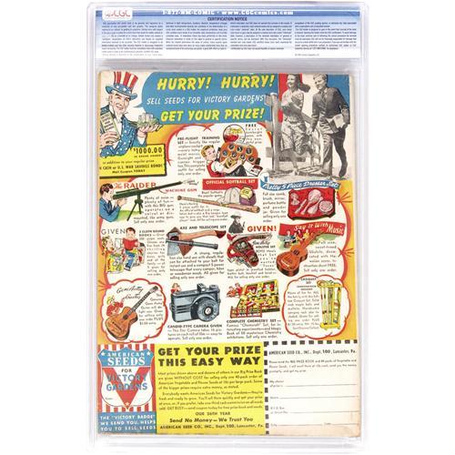 <B>Superman #27 Davis Crippen ("D" Copy) pedigree (DC, 1944) CGC VF 8.0 Cream to off-white pages.</B></I> As you may have noticed while perusing this section, most of the "D" copies did not actually have a "D" on them, but here's one that does, and more importantly it has the collection's characteristic high grade. In this issue, Superman takes on the villainous Toyman and his scheme for a "dollar arcade" (back when a penny arcade was the norm - little did Toyman know that a buck a game would one day be the going rate)! The Lois Lane cover is by Wayne Boring. Overstreet 2006 VF 8.0 value = $800. CGC census 6/06: 3 in 8.0, 8 higher. <I>From the Crippen Collection.</B></I> <BR><BR><B>Important notice:</B> Heritage usually auctions material at the rate of 200-250 lots per hour. On some occasions eBay Live bid software or the Internet may not be able to keep up with the pace of the auction. We recommend placing a realistic absentee bid now as insurance to avoid disappointment. Occasionally the auctioneer may eliminate or reject an eBay Live bid, and the auctioneer may also reopen a lot after the close of the eBay live bidding (usually because we missed an audience bid), and may reject your bid even if it shows you as the winning bidder. By bidding via eBay Live, you agree that Heritage may award the lot to another bidder at its sole discretion under the circumstances described above or any other reasonable circumstances. Since eBay bids are not shown to us until we open the lot on the floor, we treat those bids just like floor bids. In most cases the floor responds before the eBay bid is presented to us, due to Internet lag time, so for consistency we have made it a policy that floor bids are always considered first over tie eBay live bids. Also please note that all Heritage lots purchased through eBay Live carry a 22.5% Buyer's Premium. Please make sure you read the Terms and Conditions before you bid. This lot is being auctioned in conjunction with a live floor auction by Heritage Auction Galleries. All final auction and invoice information will be supplied by Heritage Auction Galleries, and all other information should be considered preliminary. Lot:41001 <BR><BR><B>Winning Notification and Billing:</B> After the FINAL session in this auction is complete, Heritage will send e-mail and snail mail invoices. This process normally takes several days. All final auction and invoice information will be supplied by Heritage Auction Galleries, and all other information should be considered preliminary. <BR><BR>This auction will be conducted on a live auction floor and over the Internet through eBay Live. If you choose to place an absentee bid, please take a moment to <font color='#0000ff'><u><a href='http://pages.ebay.com/liveauctions/help/before/laabsentee.html'>learn how eBay Live absentee bidding works</a></u></font><font color='#000000'>