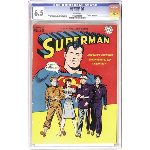 <B>Superman #29 (DC, 1944) CGC FN+ 6.5 White pages.</B></I> Lois Lane makes a cover appearance, spotlighting the Army, Navy, and Marine Corps. The Prankster appears in one story. Sharp looking copy, sporting white interior pages. Overstreet 2006 FN 6.0 value = $384; VF 8.0 value = $800. CGC census 6/06: 4 in 6.5, 15 higher. <BR><BR><B>Important notice:</B> Heritage usually auctions material at the rate of 200-250 lots per hour. On some occasions eBay Live bid software or the Internet may not be able to keep up with the pace of the auction. We recommend placing a realistic absentee bid now as insurance to avoid disappointment. Occasionally the auctioneer may eliminate or reject an eBay Live bid, and the auctioneer may also reopen a lot after the close of the eBay live bidding (usually because we missed an audience bid), and may reject your bid even if it shows you as the winning bidder. By bidding via eBay Live, you agree that Heritage may award the lot to another bidder at its sole discretion under the circumstances described above or any other reasonable circumstances. Since eBay bids are not shown to us until we open the lot on the floor, we treat those bids just like floor bids. In most cases the floor responds before the eBay bid is presented to us, due to Internet lag time, so for consistency we have made it a policy that floor bids are always considered first over tie eBay live bids. Also please note that all Heritage lots purchased through eBay Live carry a 22.5% Buyer's Premium. Please make sure you read the Terms and Conditions before you bid. This lot is being auctioned in conjunction with a live floor auction by Heritage Auction Galleries. All final auction and invoice information will be supplied by Heritage Auction Galleries, and all other information should be considered preliminary. Lot:41001 <BR><BR><B>Winning Notification and Billing:</B> After the FINAL session in this auction is complete, Heritage will send e-mail and snail mail invoices. This process normally takes several days. All final auction and invoice information will be supplied by Heritage Auction Galleries, and all other information should be considered preliminary. <BR><BR>This auction will be conducted on a live auction floor and over the Internet through eBay Live. If you choose to place an absentee bid, please take a moment to <font color='#0000ff'><u><a href='http://pages.ebay.com/liveauctions/help/before/laabsentee.html'>learn how eBay Live absentee bidding works</a></u></font><font color='#000000'>