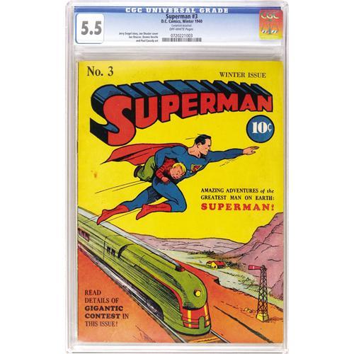 <B>Superman #3 (DC, 1940) CGC FN- 5.5 Off-white to white pages.</B></I> An early issue which stars the Greatest Superhero of all, with stories reprinted from <B>Action Comics</B></I> #5 and 6. The groovy train cover is by Joe Shuster, and the story and interior art are by Shuster and Jerry Siegel. An attractive copy of a hard-to-find book. CGC notes, "Centerfold detached." Overstreet 2006 FN 6.0 value = $2,274. CGC census 7/06: 2 in 5.5, 18 higher. <BR><BR><B>Important notice:</B> Heritage usually auctions material at the rate of 200-250 lots per hour. On some occasions eBay Live bid software or the Internet may not be able to keep up with the pace of the auction. We recommend placing a realistic absentee bid now as insurance to avoid disappointment. Occasionally the auctioneer may eliminate or reject an eBay Live bid, and the auctioneer may also reopen a lot after the close of the eBay live bidding (usually because we missed an audience bid), and may reject your bid even if it shows you as the winning bidder. By bidding via eBay Live, you agree that Heritage may award the lot to another bidder at its sole discretion under the circumstances described above or any other reasonable circumstances. Since eBay bids are not shown to us until we open the lot on the floor, we treat those bids just like floor bids. In most cases the floor responds before the eBay bid is presented to us, due to Internet lag time, so for consistency we have made it a policy that floor bids are always considered first over tie eBay live bids. Also please note that all Heritage lots purchased through eBay Live carry a 22.5% Buyer's Premium. Please make sure you read the Terms and Conditions before you bid. This lot is being auctioned in conjunction with a live floor auction by Heritage Auction Galleries. All final auction and invoice information will be supplied by Heritage Auction Galleries, and all other information should be considered preliminary. Lot:41001 <BR><BR><B>Winning Notification and Billing:</B> After the FINAL session in this auction is complete, Heritage will send e-mail and snail mail invoices. This process normally takes several days. All final auction and invoice information will be supplied by Heritage Auction Galleries, and all other information should be considered preliminary. <BR><BR>This auction will be conducted on a live auction floor and over the Internet through eBay Live. If you choose to place an absentee bid, please take a moment to <font color='#0000ff'><u><a href='http://pages.ebay.com/liveauctions/help/before/laabsentee.html'>learn how eBay Live absentee bidding works</a></u></font><font color='#000000'>