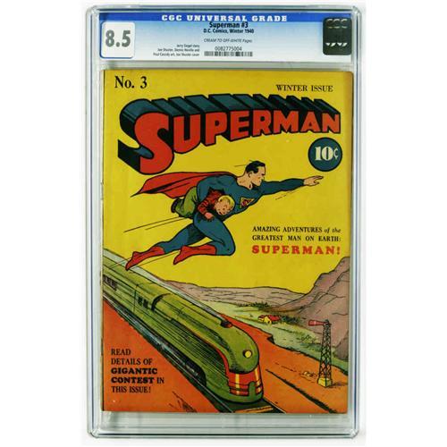 <B>Superman #3 (DC, 1940) CGC VF+ 8.5 Cream to off-white pages.</B></I> From the days before the familiar DC logo adorned the cover, comes the third issue of this mighty title. Artists include Joe Shuster, Paul Cassidy, and Dennis Neville. Early <B>Superman</B></I>s like this are quite tough to find in high grade, which is strange considering how popular and widely circulated the series was. This pleasing copy is currently tied with just two others as highest CGC-graded. It's solid and sharp, with only minimal wear and a few very light dust shadows near the edges. Get those bids up, up, and away! Overstreet 2005 VF 8.0 value = $5,194; VF/NM 9.0 value = $8,347. CGC census 11/05: 3 in 8.5, none higher.