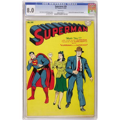 <B>Superman #30 (DC, 1944) CGC VF 8.0 White pages.</B></I> On this issue's Jack Burnley cover, Lois passes up Superman for...Clark! Has the entire world gone crazy? This must be a result of the fact that Mr. Mxyztplk, that inter-dimensional imp, makes his first comic book appearance here (he had first appeared a few months earlier in the <I>Superman</B></I> newspaper strip); in time, his name would evolve into Mxyzptlk. Interior artists include Ira Yarbrough, Ed Dobrotka, and Henry Boltinoff. Overstreet 2006 VF 8.0 value = $1,550. CGC census 12/06: 1 in 8.0, 6 higher.<BR><BR><b>Shipping:</b> Slabbed Comic (<a target="_blank" href="http://www.heritageauctions.com/common/shipping.php">view shipping information</a>)