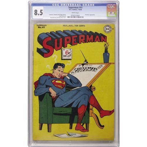 <B>Superman #41 (DC, 1946) CGC VF+ 8.5 White pages.</B></I> The Prankster makes an appearance in this issue, and Supes seems none too enthused at the prospect in this Wayne Boring cover. CGC has certified just two copies nicer to date -- and barely, at VF/NM 9.0. Overstreet 2006 VF 8.0 value = $531; VF/NM 9.0 value = $841. CGC census 9/06: 4 in 8.5, 2 higher.<BR><BR><b>Shipping:</b> Slabbed Comic (<a target="_blank" href="http://www.heritageauctions.com/common/shipping.php">view shipping information</a>)