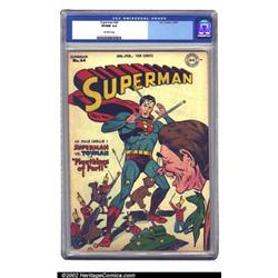 Superman #44 (DC, 1947) CGC VF/NM 9.0 Off-white pages. The Man of Steel is challenged by Toyman and his miniature minions on this Wayne Boring cover. Copies of this issue are relatively common, but this is the nicest copy CGC has graded to date of issue #44. Don't you really want the best? Overstreet 2002 NM 9.4 value = $875. Important notice: We expect to be auctioning lots at the rate of 200-250 per hour. Sometimes eBay Premier live bid software cannot keep up with that pace, so we strongly recommend that you place a realistic proxy bid now as insurance to avoid disappointment. Also please note that all Heritage/CAA lots purchased through eBay Premier carry a 20% Buyer's Premium. Please make sure you read the Terms and Conditions.