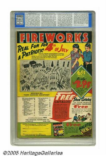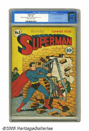<B>Superman #5 (DC, 1940) CGC VF- 7.5 Cream to off-white pages.</B></I> This issue has the fourth appearance of Lex Luthor, in fact it's the last of the few stories in which Lex still had hair. Both Superman's co-creator Joe Shuster and the next great Supes artist, Wayne Boring, drew stories for this issue. CGC notes, "Small tear at centerfold. Moderate tanning interior front and back cover." Overstreet 2005 VF 8.0 value = $3,164. CGC census 2/05: 3 in 7,5, 6 higher.