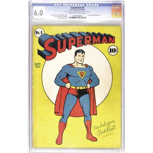 <B>Superman #6 (DC, 1940) CGC FN 6.0 Cream to off-white pages.</B></I> "Very truly yours, Clark Kent", reads the inscription on Joe Shuster's cover, featuring a posed Man of Steel. Other artists include Jack Burnley. CGC notes, "3 pieces of tape on 8th page, 1 piece of tape on 28th page." Please note a small crack in the CGC holder; it does not affect the comic inside. Overstreet 2006 FN 6.0 value = $909. CGC census 6/06: 1 in 6.0, 8 higher. <BR><BR><B>Important notice:</B> Heritage usually auctions material at the rate of 200-250 lots per hour. On some occasions eBay Live bid software or the Internet may not be able to keep up with the pace of the auction. We recommend placing a realistic absentee bid now as insurance to avoid disappointment. Occasionally the auctioneer may eliminate or reject an eBay Live bid, and the auctioneer may also reopen a lot after the close of the eBay live bidding (usually because we missed an audience bid), and may reject your bid even if it shows you as the winning bidder. By bidding via eBay Live, you agree that Heritage may award the lot to another bidder at its sole discretion under the circumstances described above or any other reasonable circumstances. Since eBay bids are not shown to us until we open the lot on the floor, we treat those bids just like floor bids. In most cases the floor responds before the eBay bid is presented to us, due to Internet lag time, so for consistency we have made it a policy that floor bids are always considered first over tie eBay live bids. Also please note that all Heritage lots purchased through eBay Live carry a 22.5% Buyer's Premium. Please make sure you read the Terms and Conditions before you bid. This lot is being auctioned in conjunction with a live floor auction by Heritage Auction Galleries. All final auction and invoice information will be supplied by Heritage Auction Galleries, and all other information should be considered preliminary. Lot:41001 <BR><BR><B>Winning Notification and Billing:</B> After the FINAL session in this auction is complete, Heritage will send e-mail and snail mail invoices. This process normally takes several days. All final auction and invoice information will be supplied by Heritage Auction Galleries, and all other information should be considered preliminary. <BR><BR>This auction will be conducted on a live auction floor and over the Internet through eBay Live. If you choose to place an absentee bid, please take a moment to <font color='#0000ff'><u><a href='http://pages.ebay.com/liveauctions/help/before/laabsentee.html'>learn how eBay Live absentee bidding works</a></u></font><font color='#000000'>