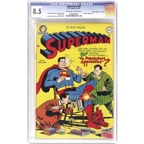 <B>Superman #69 Davis Crippen ("D" Copy) pedigree (DC, 1951) CGC VF+ 8.5 Off-white to white pages.</B></I> This very nice-looking copy is (as of this writing) the only copy graded above 7.0 by CGC. The Prankster appears here, and this time he's got his very own sidekick, named Al Fresco (groan). The cover art is by Wayne Boring. Overstreet 2006 VF 8.0 value = $419; VF/NM 9.0 value = $665. CGC census 6/06: 1 in 8.5, none higher. <I>From the Crippen Collection.</B></I> <BR><BR><B>Important notice:</B> Heritage usually auctions material at the rate of 200-250 lots per hour. On some occasions eBay Live bid software or the Internet may not be able to keep up with the pace of the auction. We recommend placing a realistic absentee bid now as insurance to avoid disappointment. Occasionally the auctioneer may eliminate or reject an eBay Live bid, and the auctioneer may also reopen a lot after the close of the eBay live bidding (usually because we missed an audience bid), and may reject your bid even if it shows you as the winning bidder. By bidding via eBay Live, you agree that Heritage may award the lot to another bidder at its sole discretion under the circumstances described above or any other reasonable circumstances. Since eBay bids are not shown to us until we open the lot on the floor, we treat those bids just like floor bids. In most cases the floor responds before the eBay bid is presented to us, due to Internet lag time, so for consistency we have made it a policy that floor bids are always considered first over tie eBay live bids. Also please note that all Heritage lots purchased through eBay Live carry a 22.5% Buyer's Premium. Please make sure you read the Terms and Conditions before you bid. This lot is being auctioned in conjunction with a live floor auction by Heritage Auction Galleries. All final auction and invoice information will be supplied by Heritage Auction Galleries, and all other information should be considered preliminary. Lot:41001 <BR><BR><B>Winning Notification and Billing:</B> After the FINAL session in this auction is complete, Heritage will send e-mail and snail mail invoices. This process normally takes several days. All final auction and invoice information will be supplied by Heritage Auction Galleries, and all other information should be considered preliminary. <BR><BR>This auction will be conducted on a live auction floor and over the Internet through eBay Live. If you choose to place an absentee bid, please take a moment to <font color='#0000ff'><u><a href='http://pages.ebay.com/liveauctions/help/before/laabsentee.html'>learn how eBay Live absentee bidding works</a></u></font><font color='#000000'>