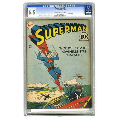 <B>Superman #7 (DC, 1940) CGC FN+ 6.5 Cream to off-white pages.</B></I> The <I>Daily Planet</B></I>'s gruff but lovable editor, Perry White, is introduced and featured in this issue, although his first name would not be revealed until issue #10. Joe Shuster, Wayne Boring, and George Papp all contributed art. Overstreet 2006 FN 6.0 value = $909; VF 8.0 value = $1,970. CGC census 3/06: 4 in 6.5, 9 higher.