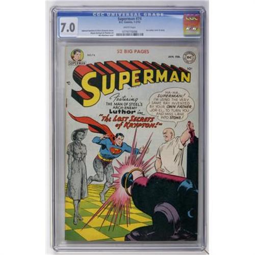 <B>Superman #74 (DC, 1952) CGC FN/VF 7.0 White pages.</B></I> Second Luthor cover appearance for this title. Win Mortimer cover. Wayne Boring and Al Plastino art. Overstreet 2007 FN 6.0 value = $210; VF 8.0 value = $438. CGC census 6/07: 2 in 7.0, 9 higher. <I> From the Warren Hall Collection.</B></I><BR><BR><b>Shipping:</b> Comics - Slabbed (certified) (<a target="_blank" href="http://www.heritageauctions.com/common/shipping.php">view shipping information</a>)