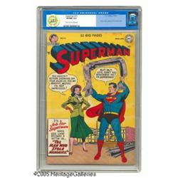 <B>Superman #75 Cover Error Variant Pacific Coast pedigree (DC, 1952) CGC VF/NM 9.0 Off-white to white pages.</B></I> This copy of #75 was erroneously printed with #74 on the cover! DC corrected the error for the majority of the print run, the result being that copies with the wrong number are harder to find; Gerber gives the variant a scarcity rating of "6" for "uncommon" as opposed to a "5" for the corrected edition. But let's not let numbering overshadow a pretty funny cover, with an amnesiac Lois Lane mistaking Supes for a Charles Atlas wannabe. This is the highest-graded copy of this cover variant edition that CGC has certified to date. Overstreet 2004 VF/NM 9.0 value = $582; NM- 9.2 value = $775. CGC census 12/04: 1 in 9.0; none higher.