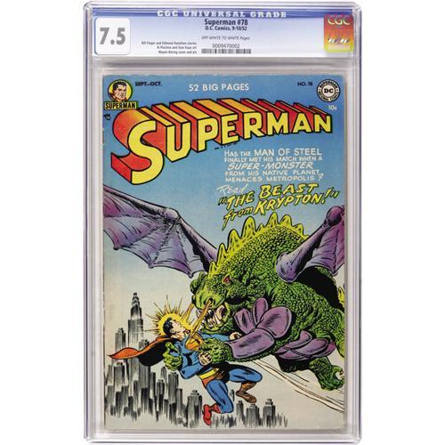 <B>Superman #78 (DC, 1952) CGC VF- 7.5 Off-white to white pages.</B></I> Love these early '50s DCs. One reason is we see them so seldom -- on the average we've offered this issue about once a year. This is the finest copy known of the last 52-page issue of the title. Lana Lang makes her first appearance in this title. Wayne Boring did the cover and contributed interior art, along with Al Plastino. Overstreet 2006 VF 8.0 value = $388. CGC census 3/07: 1 in 7.5, none higher. <I> From the Warren Hall Collection.</B></I><BR><BR><b>Shipping:</b> Comics - Slabbed (certified) (<a target="_blank" href="http://www.heritageauctions.com/common/shipping.php">view shipping information</a>)