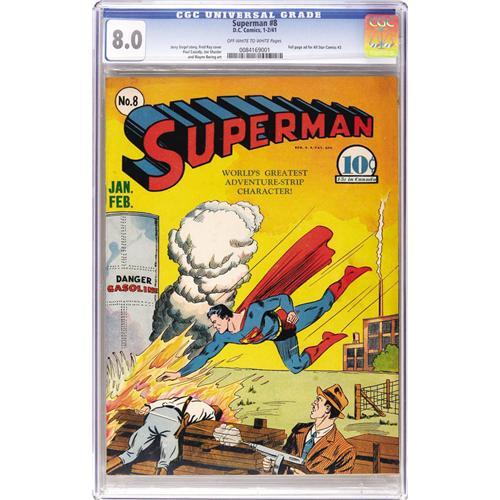 <B>Superman #8 (DC, 1941) CGC VF 8.0 Off-white to white pages.</B></I> One of the more colorful of the early issue covers is this Wayne Boring and Joe Shuster collaboration. The issue features a full-page ad for <B>All Star Comics</B></I> #3. While you're filling out your run of early <B>Superman</B></I> books, be sure to consider this copy - it's in a high grade and not that easy to find. Overstreet 2006 VF 8.0 value = $1,994. CGC census 7/06: 4 in 8.0, 7 higher. <BR><BR><B>Important notice:</B> Heritage usually auctions material at the rate of 200-250 lots per hour. On some occasions eBay Live bid software or the Internet may not be able to keep up with the pace of the auction. We recommend placing a realistic absentee bid now as insurance to avoid disappointment. Occasionally the auctioneer may eliminate or reject an eBay Live bid, and the auctioneer may also reopen a lot after the close of the eBay live bidding (usually because we missed an audience bid), and may reject your bid even if it shows you as the winning bidder. By bidding via eBay Live, you agree that Heritage may award the lot to another bidder at its sole discretion under the circumstances described above or any other reasonable circumstances. Since eBay bids are not shown to us until we open the lot on the floor, we treat those bids just like floor bids. In most cases the floor responds before the eBay bid is presented to us, due to Internet lag time, so for consistency we have made it a policy that floor bids are always considered first over tie eBay live bids. Also please note that all Heritage lots purchased through eBay Live carry a 22.5% Buyer's Premium. Please make sure you read the Terms and Conditions before you bid. This lot is being auctioned in conjunction with a live floor auction by Heritage Auction Galleries. All final auction and invoice information will be supplied by Heritage Auction Galleries, and all other information should be considered preliminary. Lot:41001 <BR><BR><B>Winning Notification and Billing:</B> After the FINAL session in this auction is complete, Heritage will send e-mail and snail mail invoices. This process normally takes several days. All final auction and invoice information will be supplied by Heritage Auction Galleries, and all other information should be considered preliminary. <BR><BR>This auction will be conducted on a live auction floor and over the Internet through eBay Live. If you choose to place an absentee bid, please take a moment to <font color='#0000ff'><u><a href='http://pages.ebay.com/liveauctions/help/before/laabsentee.html'>learn how eBay Live absentee bidding works</a></u></font><font color='#000000'>