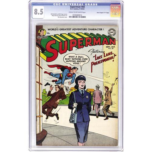 <B>Superman #84 Davis Crippen ("D"Copy) pedigree (DC, 1953) CGC VF+ 8.5 Cream to off-white pages.</B></I> This book's from near the tail end of the Crippen collection, and we're certainly glad Mr. Crippen stuck with it that long, as these pre-Silver Age superhero books are difficult finds. Lois Lane plays a prominent role in a couple of the stories here, including the cover story that has her playing the part of a policewoman while researching a story. The cover art is by Win Mortimer. Overstreet 2006 VF 8.0 value = $340; VF/NM 9.0 value = $538. CGC census 6/06: 1 in 8.5, none higher. <I>From the Crippen Collection.</B></I> <BR><BR><B>Important notice:</B> Heritage usually auctions material at the rate of 200-250 lots per hour. On some occasions eBay Live bid software or the Internet may not be able to keep up with the pace of the auction. We recommend placing a realistic absentee bid now as insurance to avoid disappointment. Occasionally the auctioneer may eliminate or reject an eBay Live bid, and the auctioneer may also reopen a lot after the close of the eBay live bidding (usually because we missed an audience bid), and may reject your bid even if it shows you as the winning bidder. By bidding via eBay Live, you agree that Heritage may award the lot to another bidder at its sole discretion under the circumstances described above or any other reasonable circumstances. Since eBay bids are not shown to us until we open the lot on the floor, we treat those bids just like floor bids. In most cases the floor responds before the eBay bid is presented to us, due to Internet lag time, so for consistency we have made it a policy that floor bids are always considered first over tie eBay live bids. Also please note that all Heritage lots purchased through eBay Live carry a 22.5% Buyer's Premium. Please make sure you read the Terms and Conditions before you bid. This lot is being auctioned in conjunction with a live floor auction by Heritage Auction Galleries. All final auction and invoice information will be supplied by Heritage Auction Galleries, and all other information should be considered preliminary. Lot:41001 <BR><BR><B>Winning Notification and Billing:</B> After the FINAL session in this auction is complete, Heritage will send e-mail and snail mail invoices. This process normally takes several days. All final auction and invoice information will be supplied by Heritage Auction Galleries, and all other information should be considered preliminary. <BR><BR>This auction will be conducted on a live auction floor and over the Internet through eBay Live. If you choose to place an absentee bid, please take a moment to <font color='#0000ff'><u><a href='http://pages.ebay.com/liveauctions/help/before/laabsentee.html'>learn how eBay Live absentee bidding works</a></u></font><font color='#000000'>
