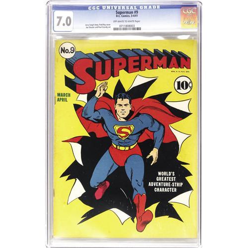 <B>Superman #9 (DC, 1941) CGC FN/VF 7.0 Off-white to white pages.</B></I> The colorful Man of Tomorrow bursts through the pages of the comic book, as seen in this Fred Ray cover illustration. This attractive copy is loaded with great eye appeal. Overstreet 2006 FN 6.0 value = $957; VF 8.0 value = $1,994. CGC census 6/06: 4 in 7.0, 8 higher. <BR><BR><B>Important notice:</B> Heritage usually auctions material at the rate of 200-250 lots per hour. On some occasions eBay Live bid software or the Internet may not be able to keep up with the pace of the auction. We recommend placing a realistic absentee bid now as insurance to avoid disappointment. Occasionally the auctioneer may eliminate or reject an eBay Live bid, and the auctioneer may also reopen a lot after the close of the eBay live bidding (usually because we missed an audience bid), and may reject your bid even if it shows you as the winning bidder. By bidding via eBay Live, you agree that Heritage may award the lot to another bidder at its sole discretion under the circumstances described above or any other reasonable circumstances. Since eBay bids are not shown to us until we open the lot on the floor, we treat those bids just like floor bids. In most cases the floor responds before the eBay bid is presented to us, due to Internet lag time, so for consistency we have made it a policy that floor bids are always considered first over tie eBay live bids. Also please note that all Heritage lots purchased through eBay Live carry a 22.5% Buyer's Premium. Please make sure you read the Terms and Conditions before you bid. This lot is being auctioned in conjunction with a live floor auction by Heritage Auction Galleries. All final auction and invoice information will be supplied by Heritage Auction Galleries, and all other information should be considered preliminary. Lot:41001 <BR><BR><B>Winning Notification and Billing:</B> After the FINAL session in this auction is complete, Heritage will send e-mail and snail mail invoices. This process normally takes several days. All final auction and invoice information will be supplied by Heritage Auction Galleries, and all other information should be considered preliminary. <BR><BR>This auction will be conducted on a live auction floor and over the Internet through eBay Live. If you choose to place an absentee bid, please take a moment to <font color='#0000ff'><u><a href='http://pages.ebay.com/liveauctions/help/before/laabsentee.html'>learn how eBay Live absentee bidding works</a></u></font><font color='#000000'>