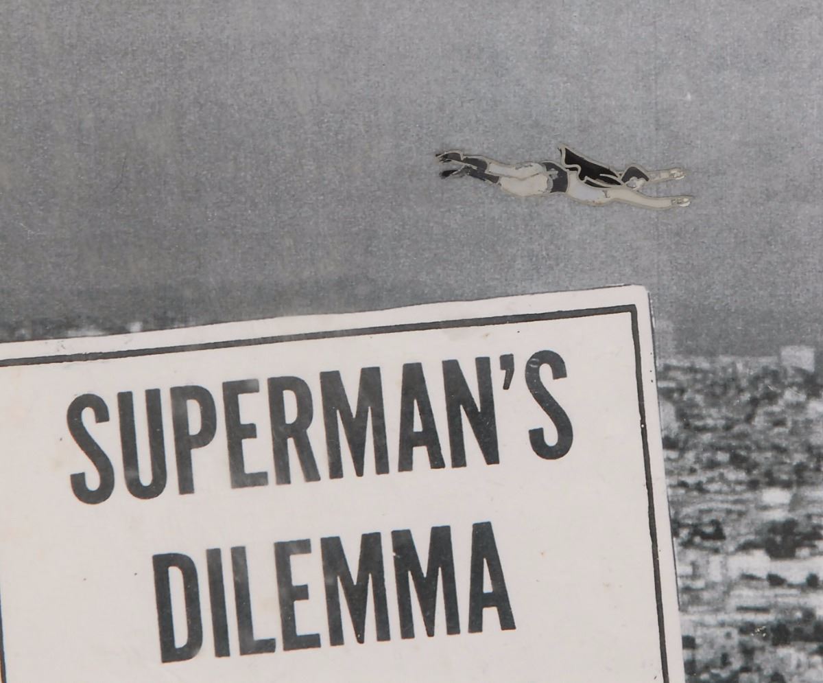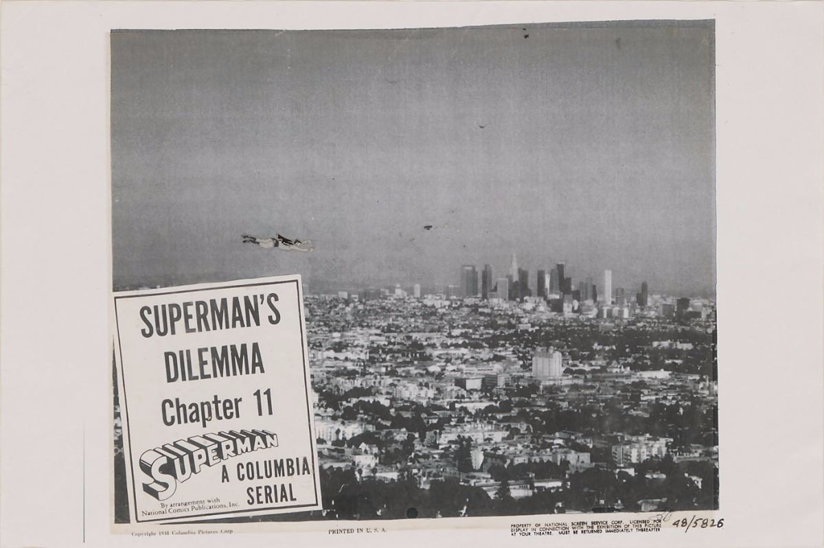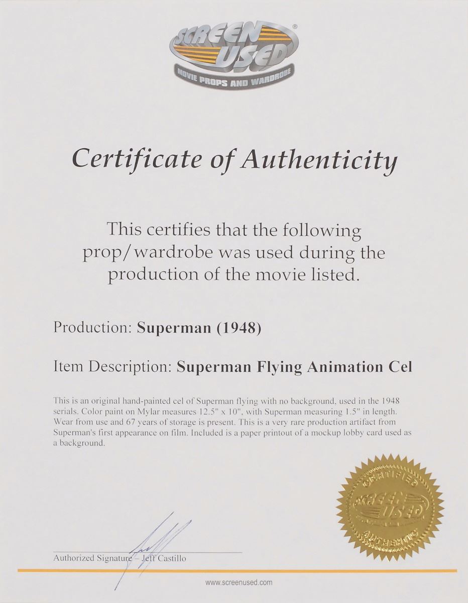 Fantastic original hand-painted production cel from the original Superman serial (Columbia Pictures, 1948), showing Superman flying with his cape fluttering behind. The cel is placed on a reproduced paperstock lobby card background. Character image measures 1.5 x .25, with an overall size of 12.5 x 10. In very good to fine condition. Accompanied by a certificate of authenticity from Screen Used. A rare and highly desirable 68-year-old production artifact from Superman's first appearance on film.