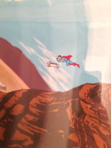 "Superman" Animation Pan (featuring "Superman" and "Superdog" flying over a missile base / includes original hand painted background / Filmation Studios / 1974 / 30.5" x 9")
