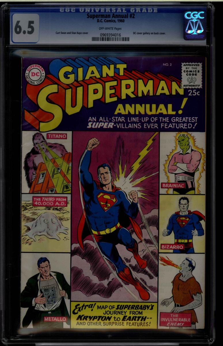 Superman Annual #2 CGC 6.5 off-white pages. Curt Swan and Stan Kaye cover. DC cover gallery on back cover. Overstreet 2009 FN 6.0 value = $114, VF 8.0 value = $293. CGC census: 2 at 6.5, 30 higher.