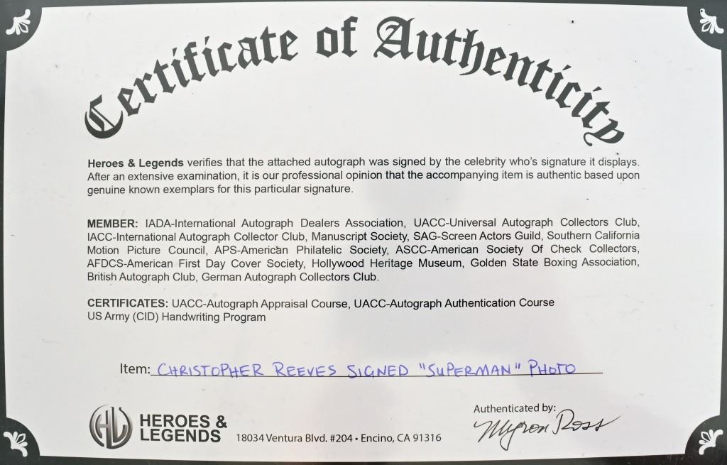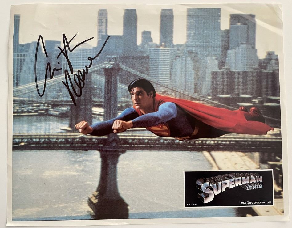 Superman Christopher Reeve signed lobby card. This is a rare item as Reeve died at 52 years old. Classic French promo photo of Superman flying. On the promo card it states Superman Le Film. 8x11 inches. HL18428