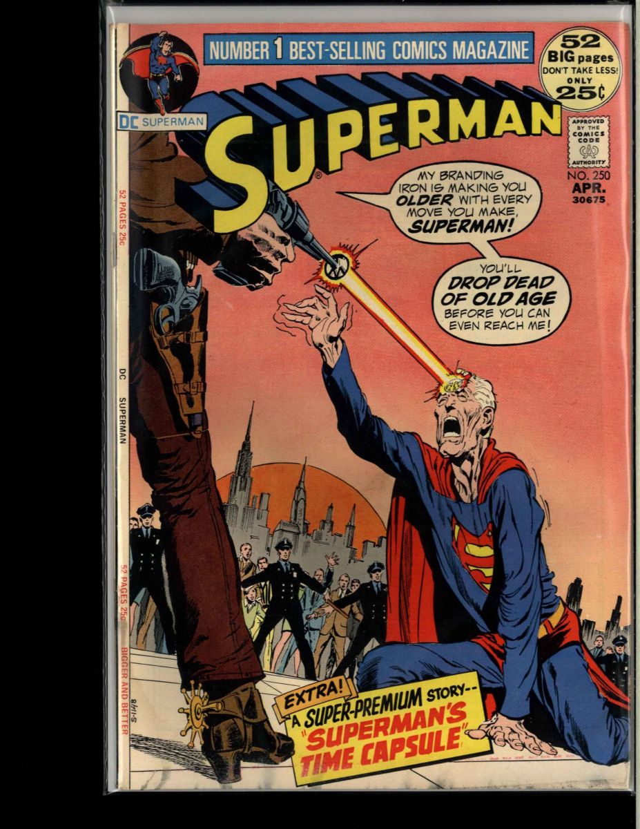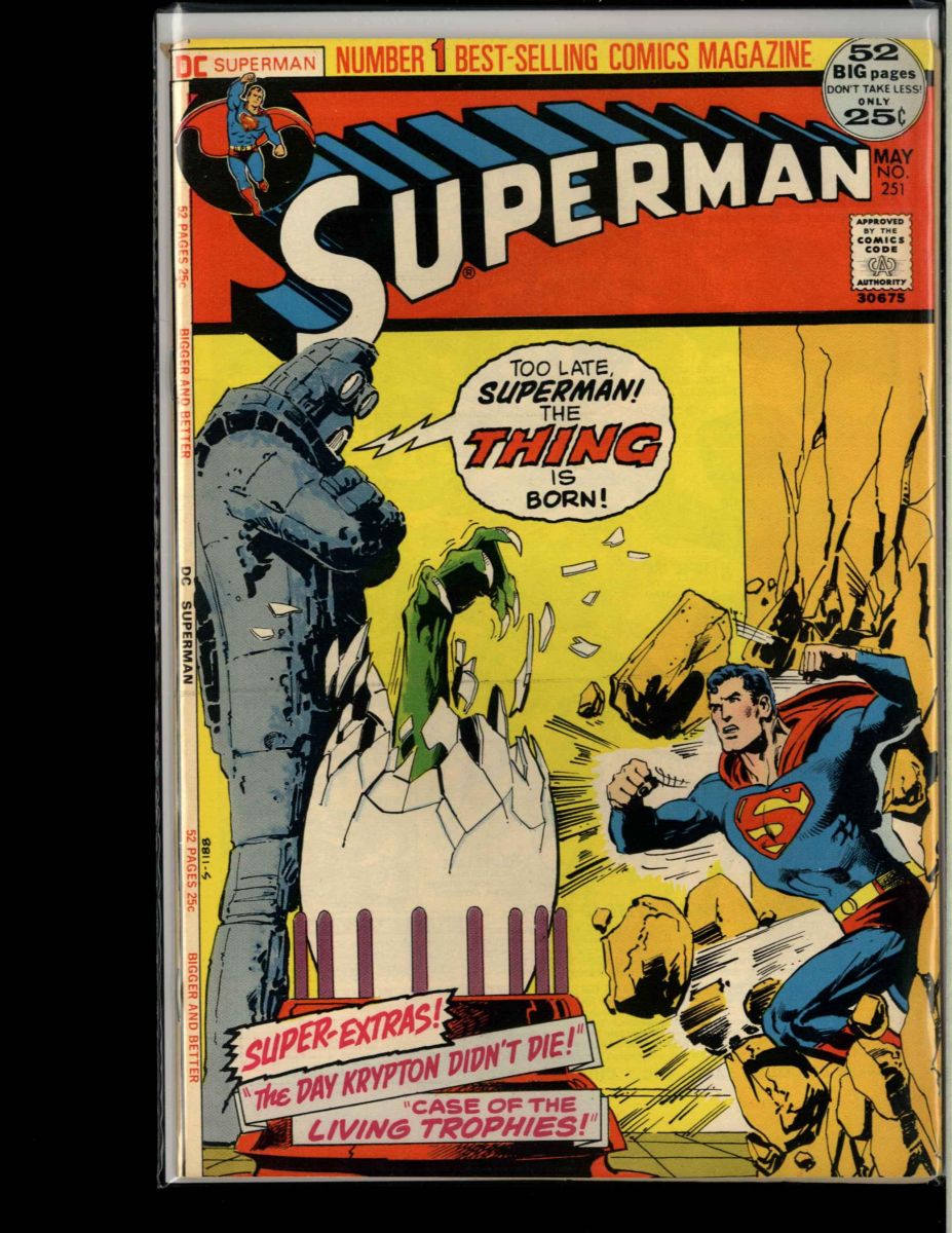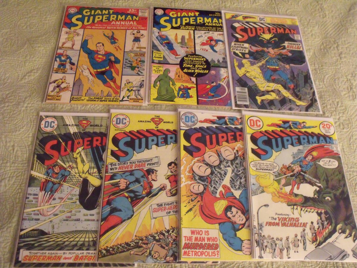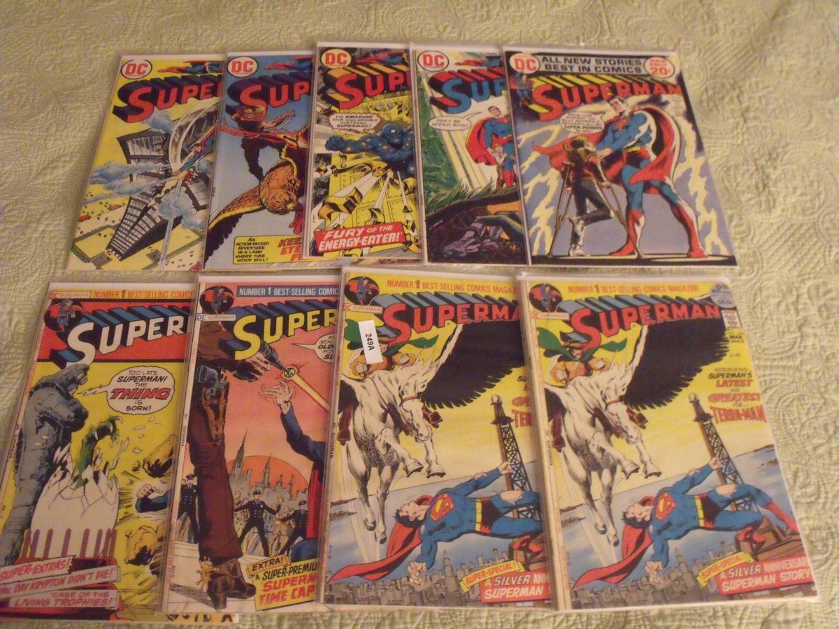 Superman #249 (x2), 250-251, 254, 257, 258, 260, 262, 270, 271, 276, 279, 303, Giant Superman Annual #4, 6. 16 issues total. Average condition ranges from VG+ to VF-