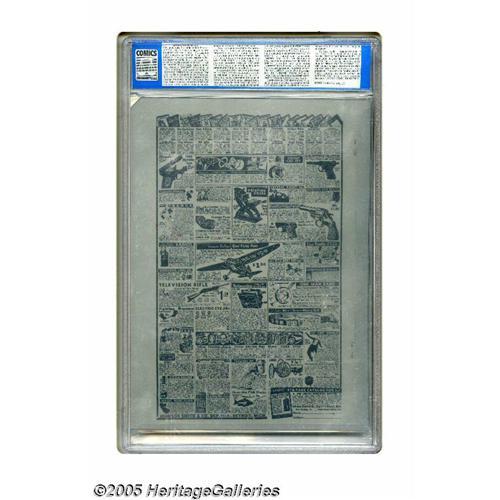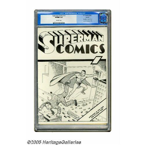 <B>Superman Comics #nn Ashcan (DC, 1939) CGC VF/NM 9.0 Off-white pages.</B></I> Here's a Superman item that's harder to find than <B>Action Comics</B></I> #1, or any other published Superman comic for that matter! It's DC's ashcan for its planned " "<B>Superman</B></I> title (an ashcan is a mock-up of a comic, produced by hand in very small quantities, for purposes of securing a copyright for a title and/or a logo). Since the danger of Superman rip-offs was very much warranted in 1939, DC's urgency in wanting to secure rights to the title is understandable! There are only two known copies of this ashcan, and both were purchased from Sol Harrison, who became president of DC Comics; this is the higher-graded of the two, we might add. As is typical for ashcans, this one features re-used art -- it's the cover art from " <B>Action Comics</B></I> #7 (by Joe Shuster) and part of the interior of "<B>Action Comics</B></I> #8. That makes this the first time that the now ultra-famous Superman logo appeared on a cover! And that's quite significant, since this is undoubtedly the most famous logo in comics. This item was bound, trimmed, and stapled by hand (and of course never intended to be a collectible) so the fact that there's a VF/NM copy in existence is amazing stuff. Note that if our back-cover scan appears dark, it's because the CGC holder has a couple of extra layers of reinforcing plastic behind the comic, no doubt to make up for this ashcan's having a much lower page count than a standard comic book. Ashcans are not listed in Overstreet. CGC census 7/05: 1 in 9.0, none higher. <BR><BR><B>Important notice:</B> Heritage usually auctions material at the rate of 200-250 lots per hour. On some occasions eBay Live bid software or the Internet may not be able to keep up with the pace of the auction. We recommend placing a realistic absentee bid now as insurance to avoid disappointment. Occasionally the auctioneer may eliminate or reject an eBay Live bid, and the auctioneer