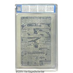Superman Comics #nn Ashcan (DC, 1939) CGC VF/NM 9.0 Off-white pages. For any Superman title collector, this is the ultimate item to acquire. This ashcan features the cover art from Action Comics #7 (which was rendered by Joe Siegel and Jerry Shuster) and a partial interior from Action Comics #8. DC produced Ashcans to secure the trademark and copyright to the title and logo. Hence, this is the first time that Superman Comics appeared on a published cover anywhere in history. Accordingly, this item might theoretically be valued much higher than the actual Superman #1 that got newsstand distribution. There are only two known copies of this ashcan, and both were purchased from Sol Harrison who worked his way up from a production assistant to President at DC comics. Again, as only a handful of ashcans were needed, they were produced by hand. The cover stock used is velox paper, which is the same material used to shoot the completed artwork of a regular comic book. Velox paper is noted for its ability to create crisp and clear lines from the artwork. Consequently, the detail on ashcans is unsurpassed. This ultimate Superman collectible has staples that are about an inch off center that go clean through to the other side of the comic. The cover is hand trimmed with nary a detracting factor. Once the importance of ashcans are fully realized by the marketplace, their values should soar. Important notice: Heritage usually auctions material at the rate of 200-250 lots per hour. On some occasions eBay Live bid software or the Internet may not be able to keep up with the pace of the auction. We recommend placing a realistic absentee bid now as insurance to avoid disappointment. Occasionally the auctioneer may eliminate or reject an eBay Live bid, and the auctioneer may also reopen a lot after the close of the eBay live bidding (usually because we missed an audience bid), and may reject your bid even if it shows you as the winning bidder. By bidding via eBay Live, you agree that Heritage may award the lot to another bidder at its sole discretion under the circumstances described above or any other reasonable circumstances. Since eBay bids are not shown to us until we open the lot on the floor, we treat those bids just like floor bids. In most cases the floor responds before the eBay bid is presented to us, due to Internet lag time, so for consistency we have made it a policy that floor bids are always considered first over tie eBay live bids. Also please note that all Heritage lots purchased through eBay Live carry a 20% Buyer's Premium. Please make sure you read the Terms and Conditions before you bid.