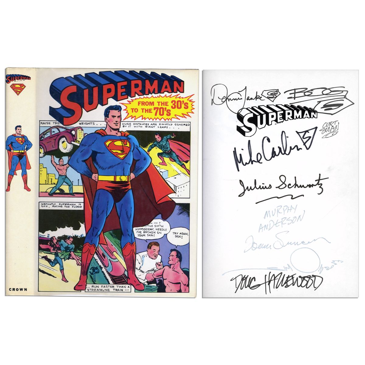 Signed hardcover of ''Superman From the 30's to the 70's,'' Crown Publishers, Inc.: New York: 1974, third printing. Nine contributors sign the fly-leaf, from Superman's early illustrators to the editors at DC Comics. The illustration team known as ''Swanderson,'' whose art defined Superman's image during the Silver Age of Comic Books, sign: ''Curt Swan'' and ''Murphy Anderson''. Also signed by ''Dennis Janke'', ''Doug Hazlewood'', and ''BOG'' (Jon Bogdanove), the illustrators of the infamous 1992 Death of Superman chapter in the saga. DC Comics' top Superman editors ''Mike Carlin'' and ''Julius Schwartz'' add their signatures, as does legendary illustrator ''[Walt] Simonson''. All autographs are in black or silver felt tip. Superman chronology features comic strips on every page, with many pages printed in full color. Runs 386pp. and measures 8'' x 10.75''. Bound in red cloth boards with blue lettering. A touch of scattered staining to front board, with minor wear to board edges, spine edges and board corners, else fine. The dustjacket is in very good condition.