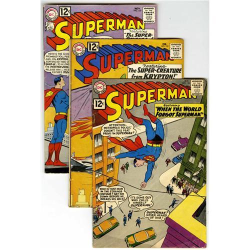 <B>Superman Group (DC, 1962-73) Condition: Average VG+.</B></I> Includes #150, 151, 157 (Gold Kryptonite used), 173 (Legion of Super-Heroes cameo), 175, 178, 179, 185, 189 (origin/destruction of Krypton II), 199 (first Superman/Flash race), 202 (80-Page Giant, all-Bizarro issue), 231, 242, 244, 254, and 265. Artists include Curt Swan, Al Plastino, Kurt Schaffenberger, Neal Adams, and Carmine Infantino. Approximate Overstreet value for group = $275.<BR><BR><b>Shipping:</b> Comics - Unslabbed (<a target="_blank" href="http://www.heritageauctions.com/common/shipping.php">view shipping information</a>)