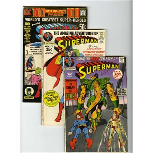 <B>Superman Group (DC, 1971-77) Condition: Average VF.</B></I> Includes #241, 243, #245 (DC 100 page Super Spectacular - FN+), #252 (DC 100 page Super Spectacular), 254, 256, 257, 276, 279, and 314; and <B>Superman</B></I> #nn (Radio Shack promo - 3 copies). Approximate Overstreet value for group = $200. <I> From the Madison Monk Collection.</B></I><BR><BR><b>Shipping:</b> Comics - Unslabbed (<a target="_blank" href="http://www.heritageauctions.com/common/shipping.php">view shipping information</a>)
