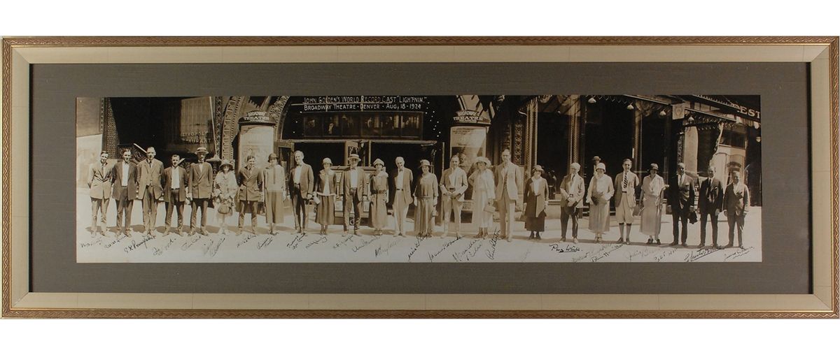 Character actor (1887–1958) best known as Daily Planet editor Perry White on the 1950s television series Adventures of Superman. Vintage sepia pearl-finish 37.5 x 10 photo, captioned in the negative “John Golden’s World Record Cast ‘Lightnin,’ Broadway Theatre, Denver, Aug. 18, 1924,” showing the cast standing outside the theatre, signed by 25 cast members. Among the signers are John Hamilton, W. W. Lucas, G. R. Pennefether, F. A. Wood, Sam Coit, Minnie Palmer, Dave Golden, Priscilla Platte, Thomas MacLarnie, Ruth Charming, W. F. Granger, Ann Merrick, H. Perry Pollock, Jessie E. Pringle, Jason Robards [Sr.], Henrietta Pedro, Paul Stanton, Mary Duryea, Margaret Campbell, Julio Brown, Chester H. Rice, James C. Lane, and others. Matted and framed to an overall size of 42.5 x 15. In very good condition, with a touch of light toning and soiling, scattered small creases, dings, and surface marks. Oversized.