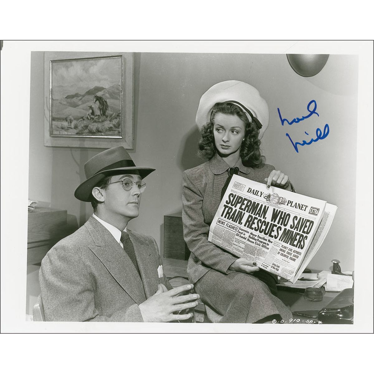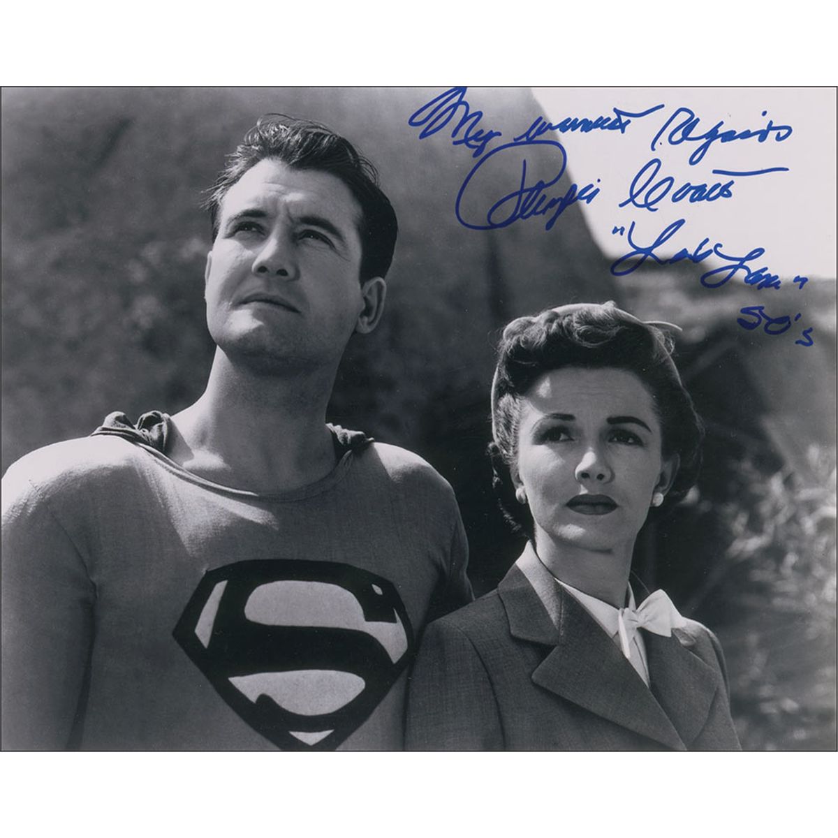 Two different glossy 10 x 8 photos of Neill and Coates from Superman, one of Lois Lane and Clark Kent, signed in blue felt tip by Neill, and the other of Lois Lane and Superman, signed in blue felt tip by Coates, adding, “My warmest regards, Phyllis Coates, ‘Lois Lane,’ 50’s.” In fine condition.