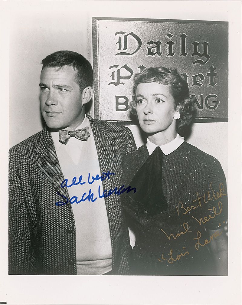 Glossy 8 x 10 photo of the pair in front of a Daily Planet sign, signed in gold ink, “Best wishes, Noel Neill, ‘Lois Lane,’” and blue felt tip, “All best, Jack Larson.” In fine condition.