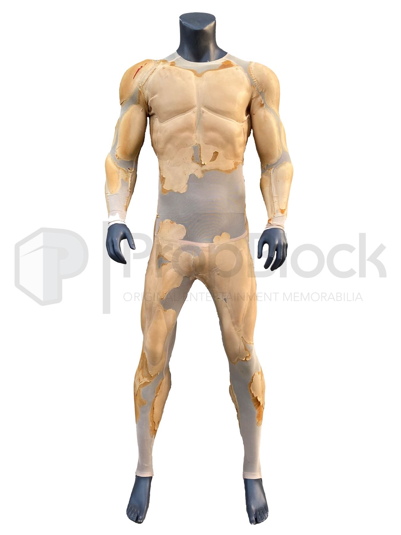 Original muscle suit used in the production of the 2006 Brian Singer film Superman Returns. Superman returns to Earth after spending five years in space examining his home world Krypton. But he finds things have changed while he was gone, and he must once again prove himself important to the world. This suit was worn by Brandon Routh under the Superman suit to fill out the costume and make it more muscular. The suit consists of a spandex/nylon full body suit made to the actors specs, and has been covered in foam latex around the arms, abdomen and legs so simulate muscles. The foam is in excellent condition and still supple. This piece remains in excellent, production used condition.