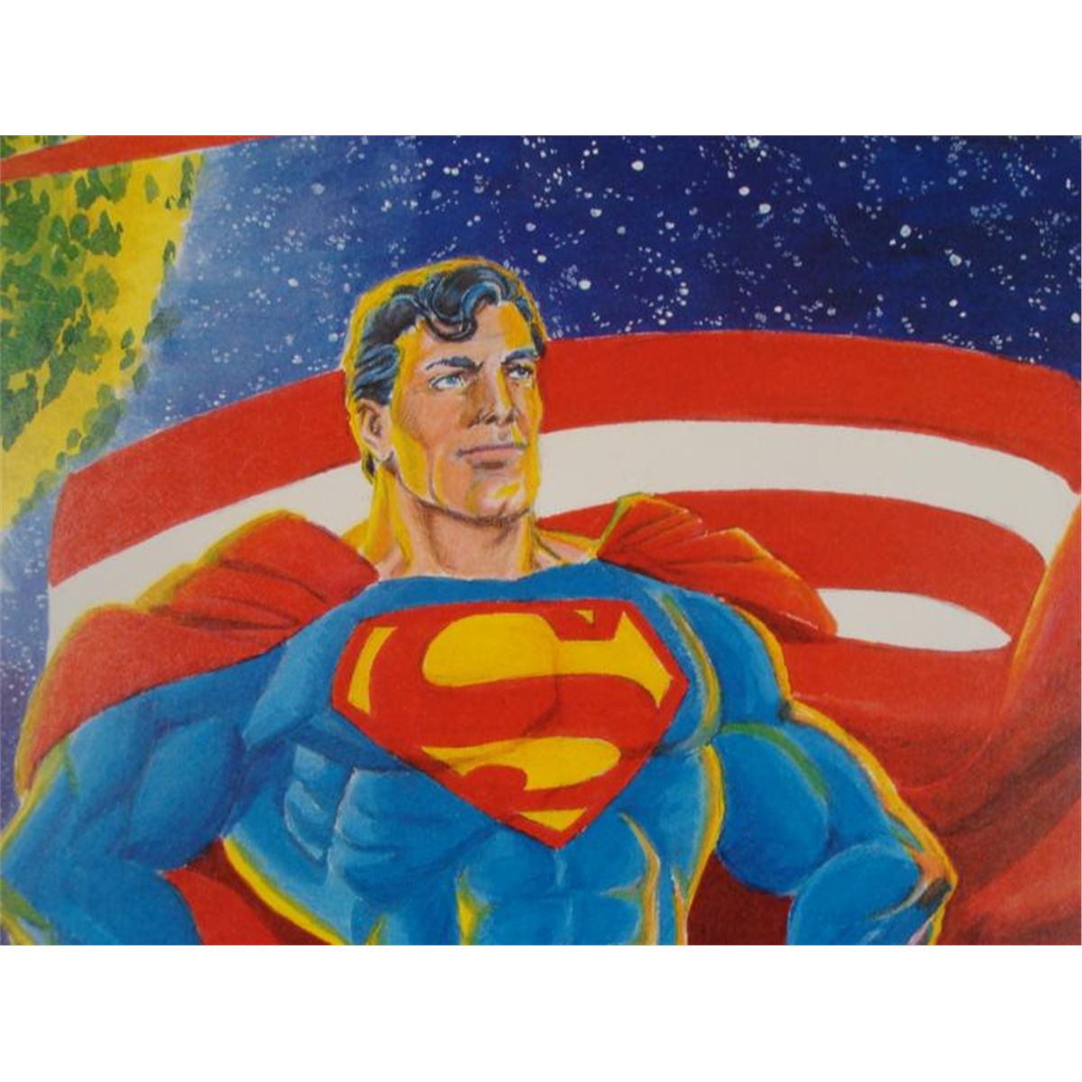 Superman, defender of all that is good and evil, watch as he transforms from a typical citizen (Clark Kent) to the hero who holds the key to our safety. * Artist: George Perez Medium: Lithograph print on paper Signature: lower right, in gold sharpie Size of Image: 13 1/4" x 18 1/4" Size of Paper: 17 1/8" x 23 1/4" Publication: First Team Press, Inc Date: 1988 Condition: Excellent Biography * George Perez (1954- ) entered the comic industry in the 1970's. He created a splash with his early work on Marvel's Man-Wolf and Deathlok the Demolisher He showed a flair for handling team books with his outstanding pencils on Fantastic Four, The Inhumans and The Avengers. George crossed over to DC in the early eighties where he took on the penciling chores on the Justice League of America. His next collaboration with Wolfman was to rebuild the whole DC Universe with Crisis on Infinite Earths. With this limited series, George drew every character in the DC Universe, a feat which he repeated in the History of the DC Universe. George established his writing credentials with a critically acclaimed relaunch of Wonder Woman. George's other works include: The Incredible Hulk: Future Imperfect and Sachs and Violens (with Peter David), inking Gil Kane's adaptation of Jurassic Park, inking for Dan Jurgens on his version of the Teen Titans, his wildly popular penciling run on the Avengers, his stunning creator owned, Crimson Plague and he and Kurt Busiek's Avengers/JLA Crossover was one of the biggest success of 2003 and he went on to provide covers for Infinite Crisis, the sequel to he and Marv Wolfman's incredible Crisis on Infinite Earths and he teamed with Mark Waid on their highly lauded run on Brave and the Bold. * Information retrieved from: http://www.pittsburghcomicon.com/guests/guestsDetail.php?George-3 *