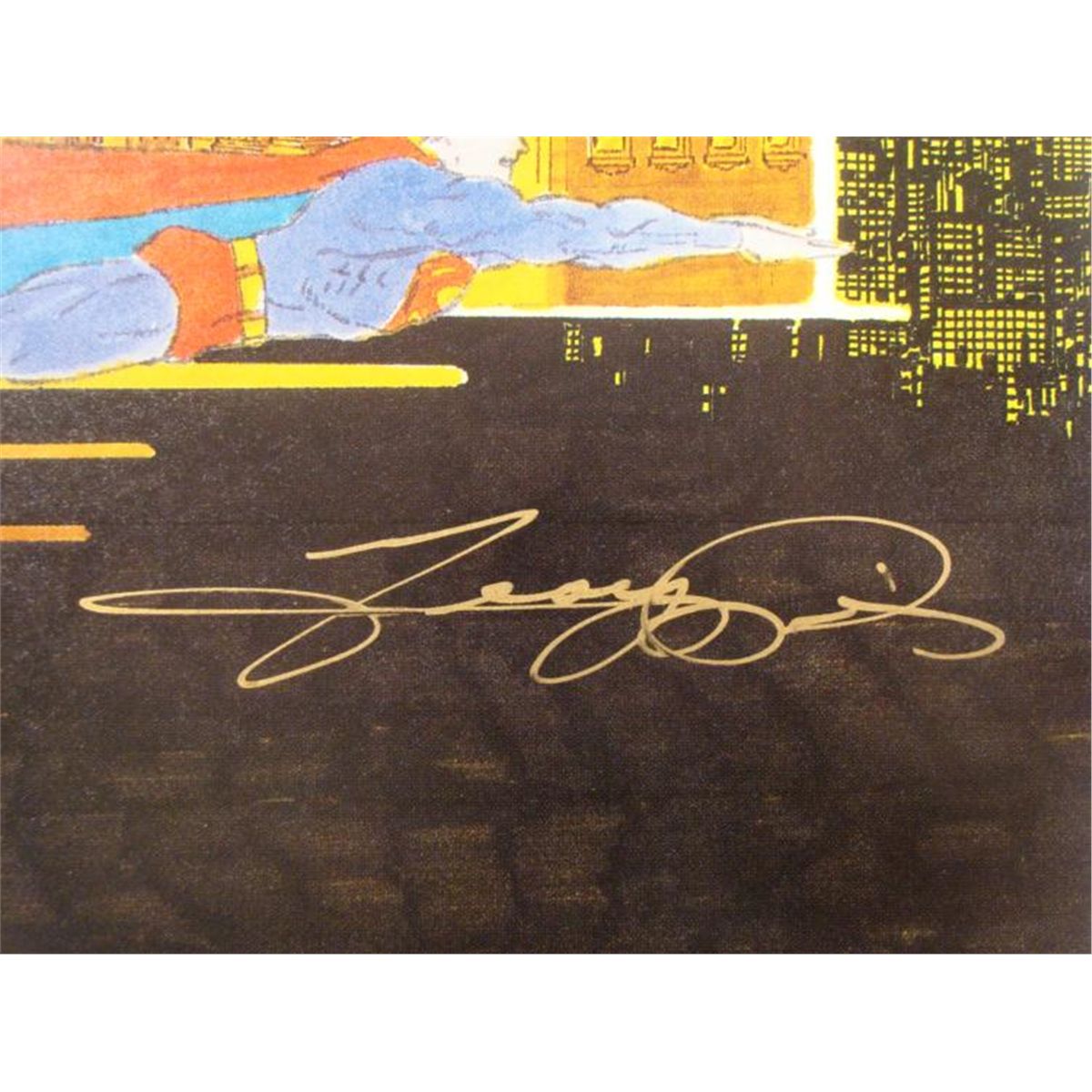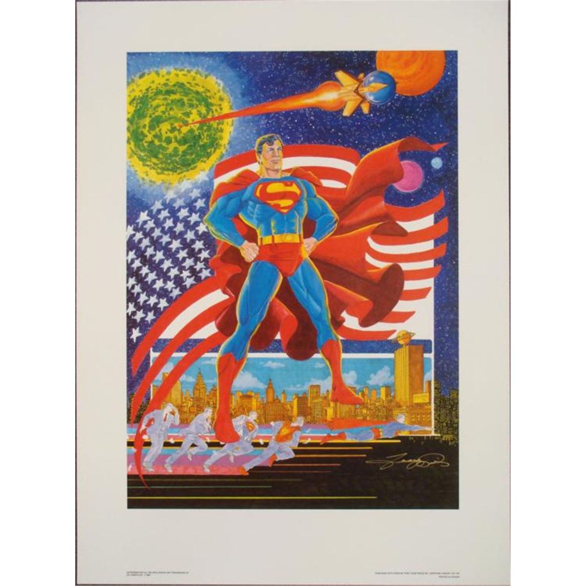 Superman, defender of all that is good and evil, watch as he transforms from a typical citizen (Clark Kent) to the hero who holds the key to our safety. * Artist: George Perez Medium: Lithograph print on paper Signature: lower right, in gold sharpie Size of Image: 13 1/4" x 18 1/4" Size of Paper: 17 1/8" x 23 1/4" Publication: First Team Press, Inc Date: 1988 Condition: Excellent Biography * George Perez (1954- ) entered the comic industry in the 1970's. He created a splash with his early work on Marvel's Man-Wolf and Deathlok the Demolisher He showed a flair for handling team books with his outstanding pencils on Fantastic Four, The Inhumans and The Avengers. George crossed over to DC in the early eighties where he took on the penciling chores on the Justice League of America. His next collaboration with Wolfman was to rebuild the whole DC Universe with Crisis on Infinite Earths. With this limited series, George drew every character in the DC Universe, a feat which he repeated in the History of the DC Universe. George established his writing credentials with a critically acclaimed relaunch of Wonder Woman. George's other works include: The Incredible Hulk: Future Imperfect and Sachs and Violens (with Peter David), inking Gil Kane's adaptation of Jurassic Park, inking for Dan Jurgens on his version of the Teen Titans, his wildly popular penciling run on the Avengers, his stunning creator owned, Crimson Plague and he and Kurt Busiek's Avengers/JLA Crossover was one of the biggest success of 2003 and he went on to provide covers for Infinite Crisis, the sequel to he and Marv Wolfman's incredible Crisis on Infinite Earths and he teamed with Mark Waid on their highly lauded run on Brave and the Bold. * Information retrieved from: http://www.pittsburghcomicon.com/guests/guestsDetail.php?George-3 *