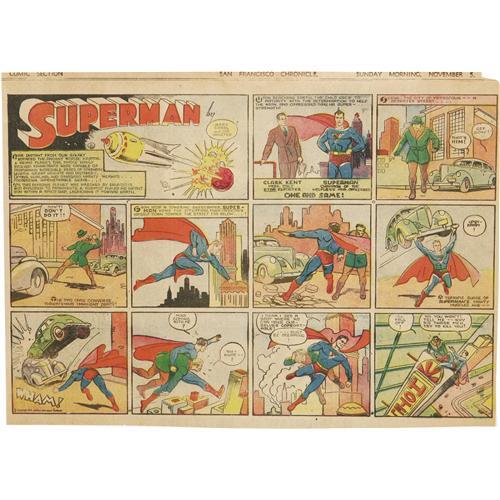 <B>Superman Sunday Comic Strips (Various, 1939-44).</B></I> Offered here are 244 Superman Sundays dated from November 5, 1939 to July 2, 1944. The image area of each strip measures approximately 9.5" x 12". They were cut from several different news papers including the <B>New York Sunday Mirror</B></I> (most of them), the <B>Sioux City Sunday Journal</B></I>, the <B>Chicago Sunday Times</B></I>, one from the <B>Washington Post</B></I>, and the first seven are from the <B>San Francisco Chronicle</B></I>. It is extremely rare to come across a complete run of Superman Sundays like this. They are in overall Very Good condition. Not listed in Overstreet.<BR><BR><b>Shipping:</b> Large Collectibles (<a target="_blank" href="http://www.heritageauctions.com/common/shipping.php">view shipping information</a>)