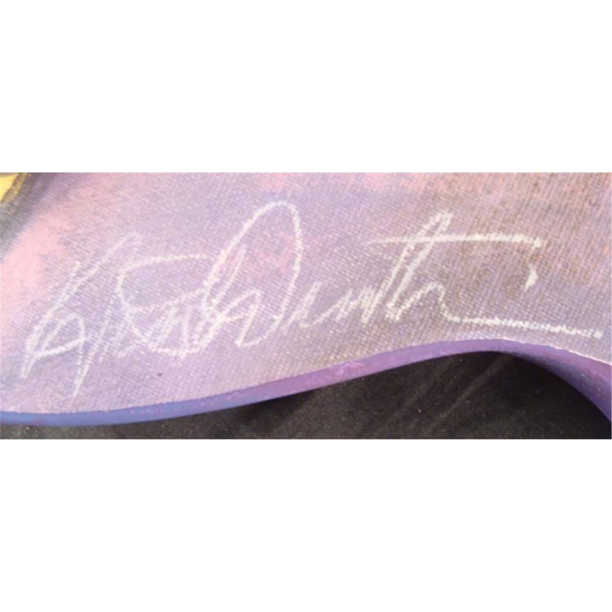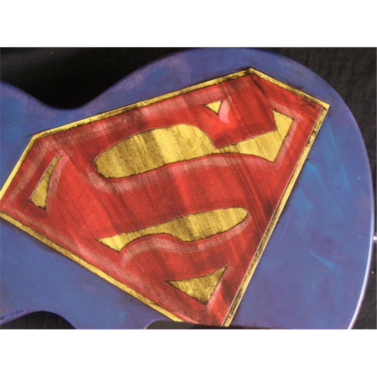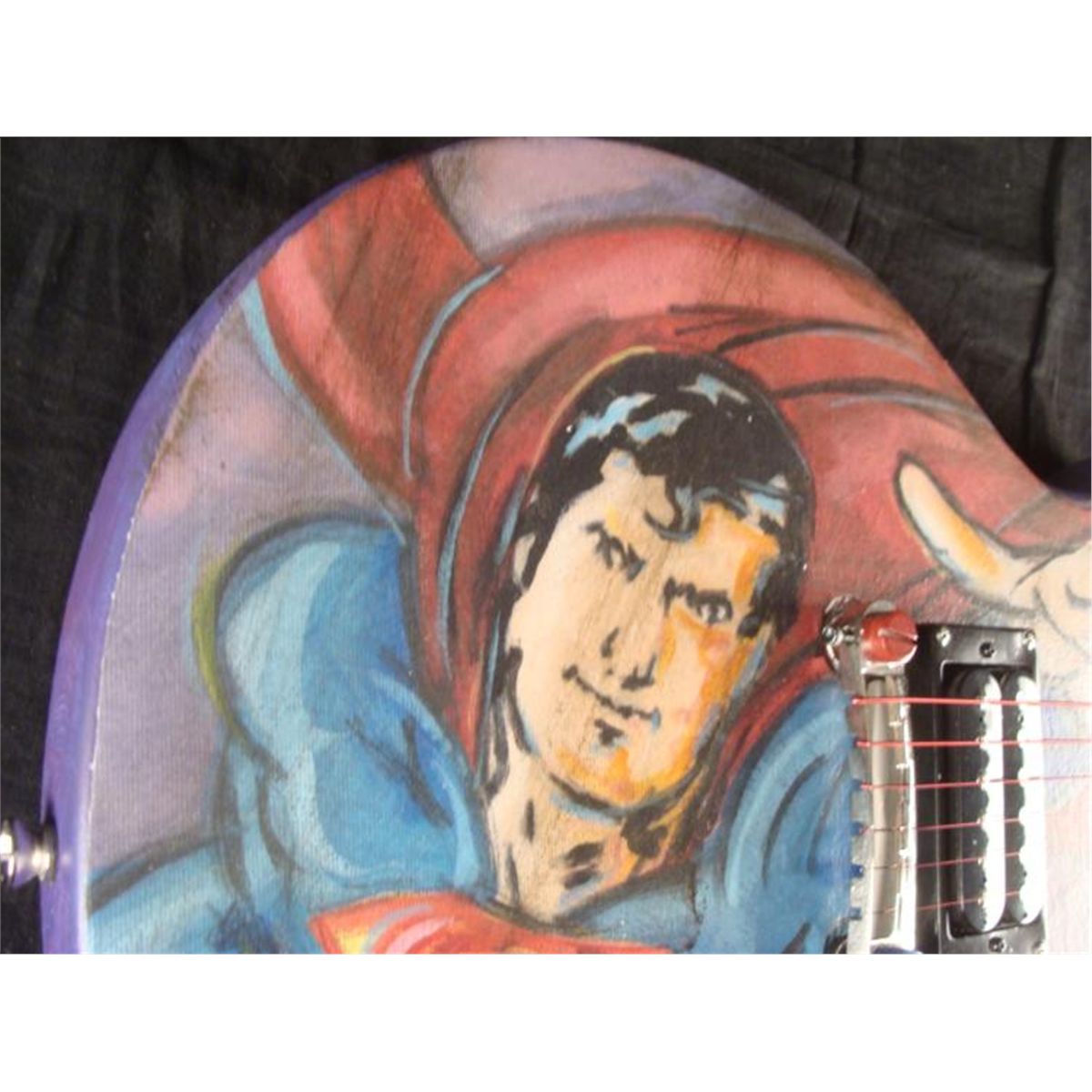 This mild-mannered Epiphone Gibson electric guitar has been transformed into a super-heroic instrument. It's a real guitar, it's hand-painted, it's Superman! This one and only original guitar was created by artist Dick Duerrstein, who has super powers of his own in the field of animation art. This guitar is certainly an exciting one, and the artist himself has sent it directly to us! * The classic pose captures the man of steel soaring through the air, ready to take on crime. What's more, hiding on the back side is Superman's logo. Imagine flipping this thing around! The paint is speckled in parts, giving it traditional comic book atmosphere. * Medium: Acrylic paint on guitar Strings are in red Signed by the artist in white marker on front Guitar: Gibson Ephiphone Junior model Serial number: 1005102673 Extras: Red dice tuners Guitar dimensions: 39" long from end to end, 13" wide at the widest, and 1 5/8" thick at the body Condition: Mint, in the original box, with instructions and cords * We can't promise you'll play faster than a speeding bullet, but certainly nothing will make you feel more powerful than this amazing Superman Guitar! * Duerrstein's art can be found in the Walt Disney Studio corporate offices, Burbank, California; The Library of Congress, Washington, D.C. and St. Jude's Research Hospital in Memphis, Tennessee and private collections worldwide. *
