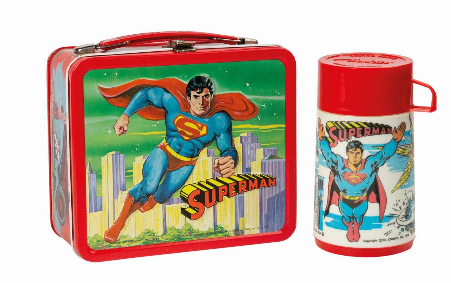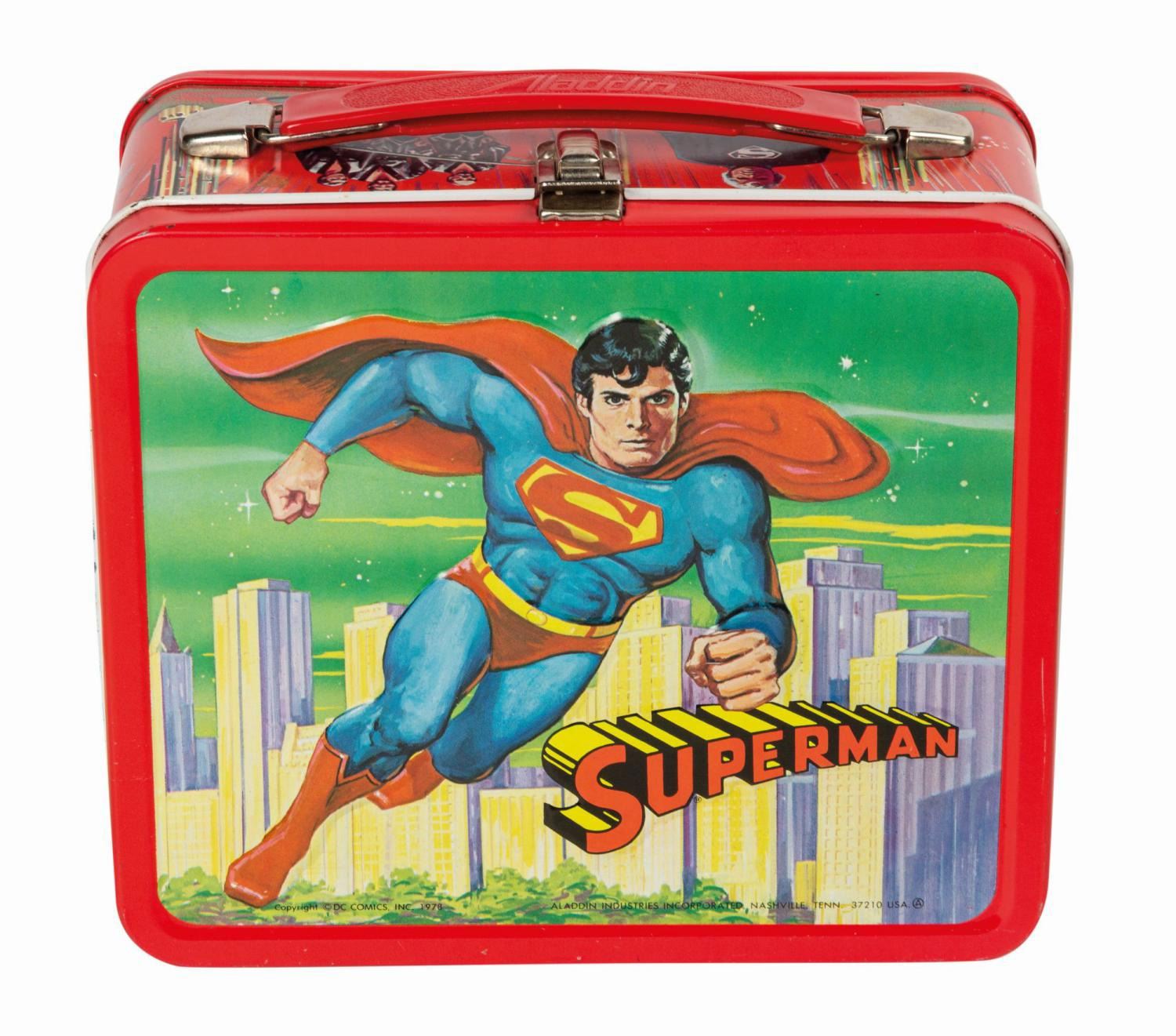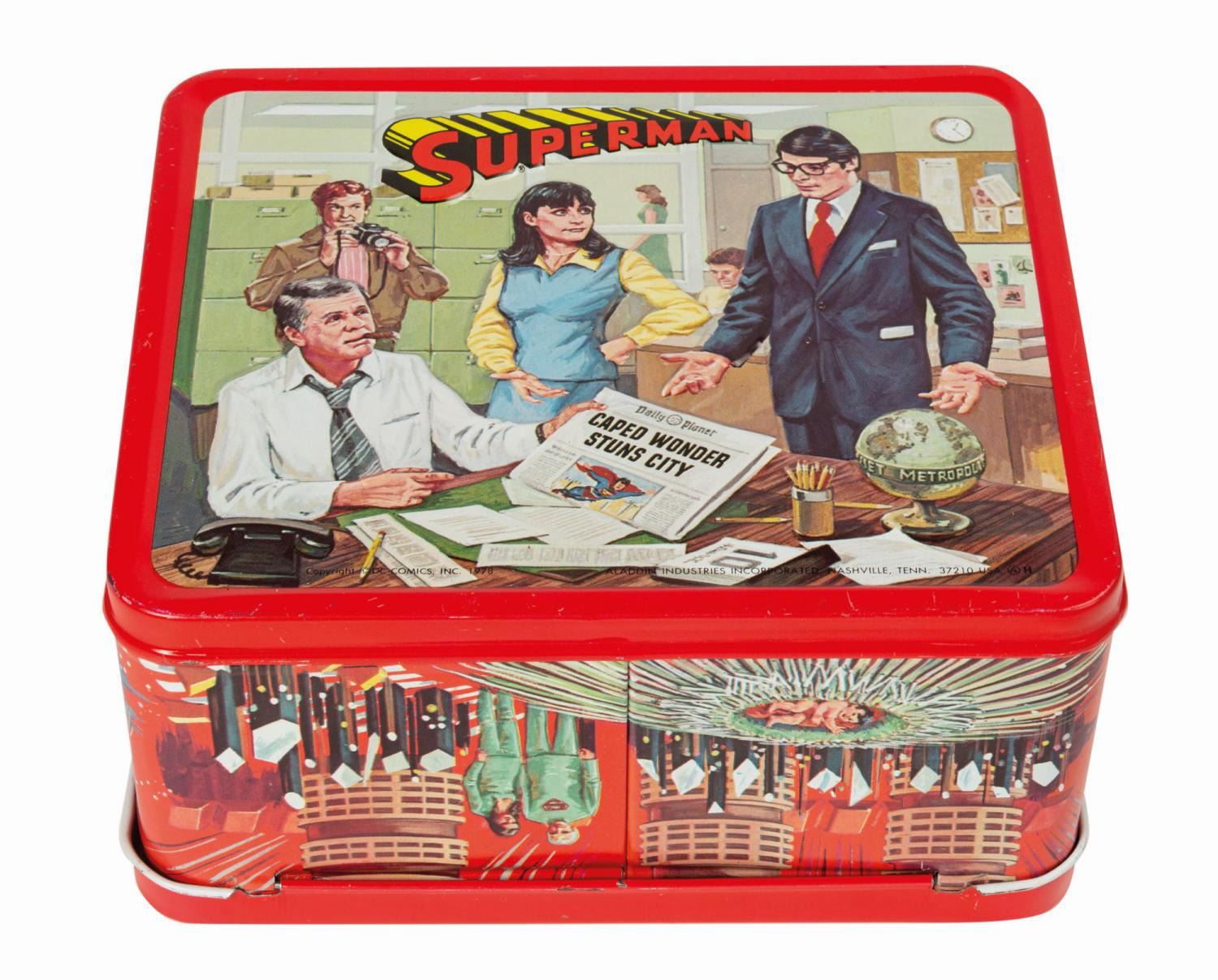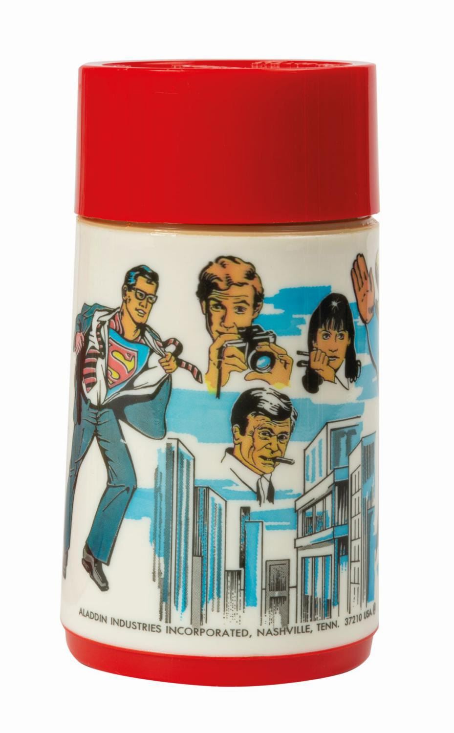 (Aladdin, 1978) A vintage embossed tin lithographic Superman: The Movie lunch box and plastic thermos manufactured by Aladdin. The lunch box has a plastic handle, hinged lid, top metal clasp closure, and an interior metal thermos clip. One side features an image of Christopher Reeve as Superman, and the other as Clark Kent at the office of the Daily Planet with Margot Kidder as Lois Lane and Jackie Cooper as Perry White. The thermos has a plastic stopper and handled plastic cup lid. Measuring 7.5"x8" and 3.75" deep, the lunch box is in very fine condition with minor edge wear. The thermos, measuring 6.5" tall x 3.5" in diameter, is in very fine condition.