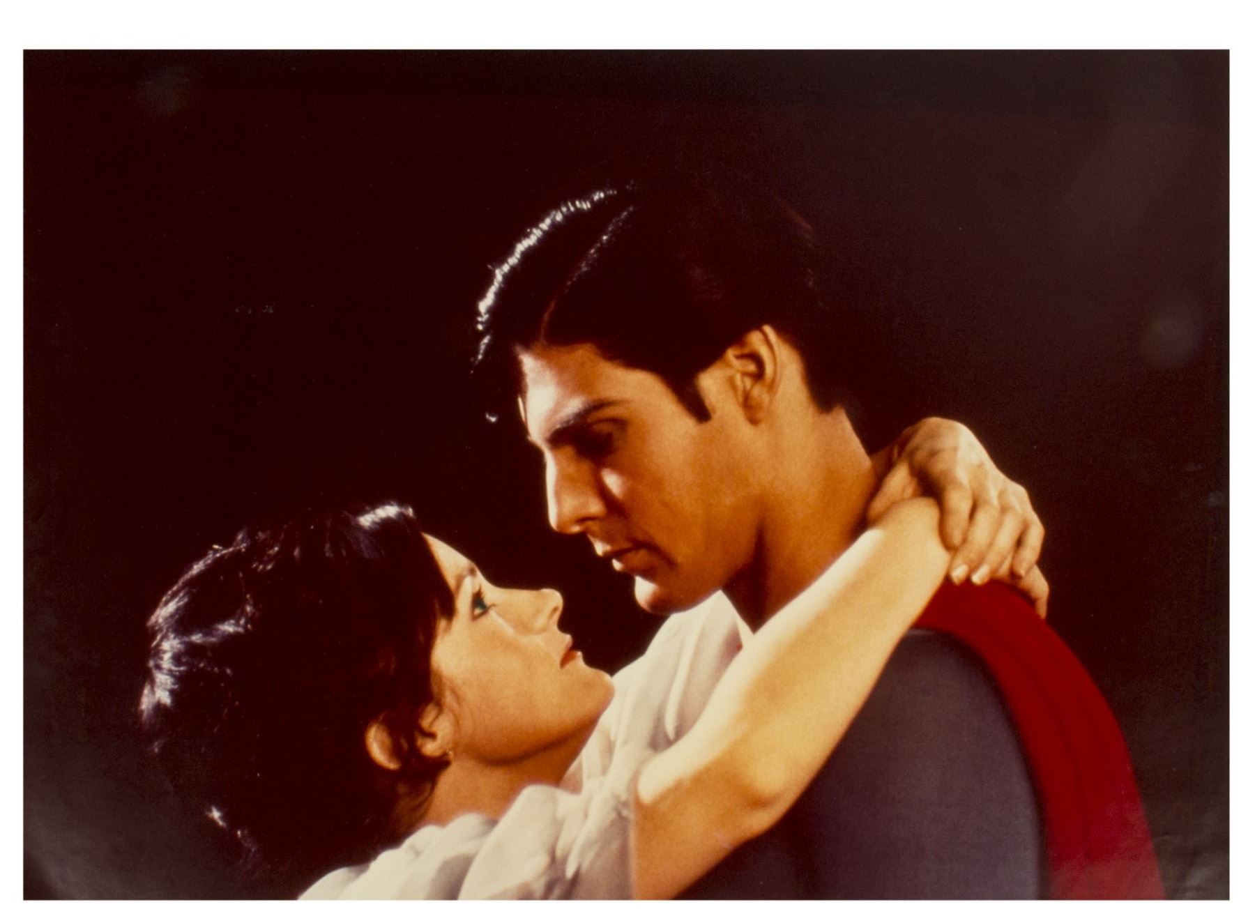 (Warner Bros, 1978) A large color photo of Christopher Reeve and Margot Kidder as Superman and Lois Lane in the feature film "Superman". This large printed photo was adhered to board and touched up with airbrush in Kidder's pupil which was too light in the original photo. Measuring 15.5"x23", the touched-up artwork is in very good condition with minor wear from use.