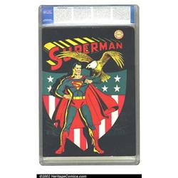 Superman Workbook #nn (DC, 1945) CGC VF- 7.5 White pages. Running 68 pages, this black and white one-shot contains old Superman stories, and as an added bonus reprints the famous Superman #14 flag cover on both the front and back. The issue number, date and price are all removed, leaving Superman's greatest cover standing alone in all of its splendor. Color flaking along the spine and edges are the main detractors from this otherwise stunning book, and the page whiteness is quite apparent through the case. Overstreet 2002 VF 8.0 value = $938. Important notice: We expect to be auctioning lots at the rate of 200-250 per hour. Sometimes eBay Premier live bid software cannot keep up with that pace, so we strongly recommend that you place a realistic proxy bid now as insurance to avoid disappointment. Also please note that all Heritage/CAA lots purchased through eBay Premier carry a 20% Buyer's Premium. Please make sure you read the Terms and Conditions.