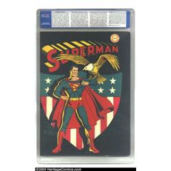 Superman Workbook #nn (DC, 1945) CGC VF- 7.5 White pages. Running 68 pages, this black and white one-shot contains old Superman stories, and as an added bonus reprints the famous Superman #14 flag cover on both the front and back. The issue number, date and price are all removed, leaving Superman's greatest cover standing alone in all of its splendor. Color flaking along the spine and edges are the main detractors from this otherwise stunning book, and the page whiteness is quite apparent through the case. Currently the only copy graded by CGC, this grade will be hard to beat. CGC notes, "From the collection of Nicolas Cage." Overstreet 2003 VF 8.0 value = $938. Important notice: Heritage usually auctions material at the rate of 200-250 lots per hour. On some occasions eBay Live bid software or the Internet may not be able to keep up with the pace of the auction. We recommend placing a realistic absentee bid now as insurance to avoid disappointment. Occasionally the auctioneer may eliminate or reject an eBay Live bid, and the auctioneer may also reopen a lot after the close of the eBay live bidding (usually because we missed an audience bid), and may reject your bid even if it shows you as the winning bidder. By bidding via eBay Live, you agree that Heritage may award the lot to another bidder at its sole discretion under the circumstances described above or any other reasonable circumstances. Also please note that all Heritage lots purchased through eBay Live carry a 20% Buyer's Premium. Please make sure you read the Terms and Conditions before you bid.