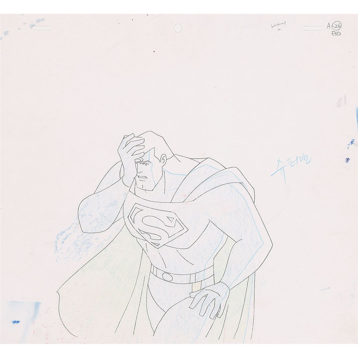 (Warner Brothers Studios, 1993) Original production cel and matching drawing featuring Superman from Superman the Animated Series, showing him deep in regret. Image measures 6.25 x 5.5, with overall dimensions of 10.5 x 9. The matched drawing is accomplished in graphite on untrimmed 10.5 x 10 animation paper. In fine condition.