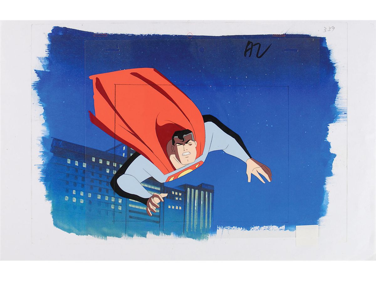 (Warner Brothers Studios, 1993) Original production cel featuring Superman from Superman the Animated Series, showing him in an iconic flying pose with his cape fluttering behind him. The cel is placed on a color copy background. Image measures 8 x 6.75, with overall dimensions of 17 x 11. In fine condition.