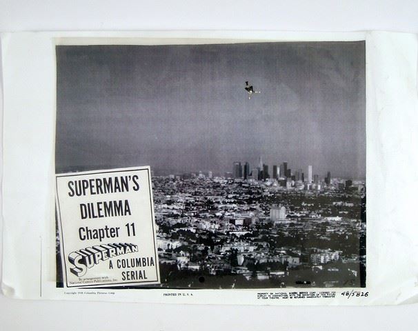 Superman's Dilemma Chapter 11 black and white Columbia Serial. SUPERMAN (1948) - from the famed Columbia serial comes this screen used animation cel depicting Superman in flight (over a recreated background of Metropolis designed to look like one of the lobby cards used to promote the film in theatres). Columbia could not afford to fly actor Kirk Alyn, so they hired Disney studios to animate the man of steel soaring over Metropolis instead. Alyn would dart from view behind a building and his animated counterpart would emerge moments later in flight. A very rare artifact from Superman's very first appearance on screen, and a charming nod to his comic book roots. (approx. 17" x 11")
