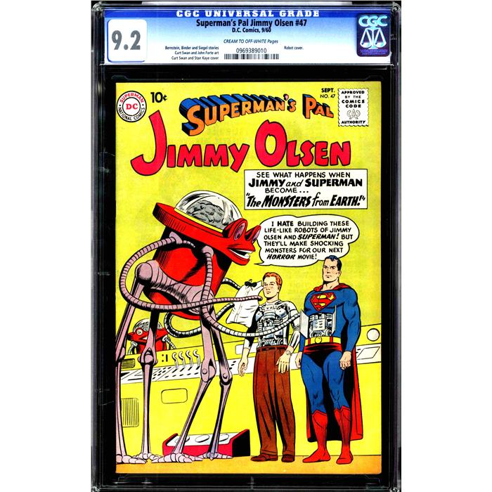 Superman's Pal Jimmy Olsen #47 CGC 9.2 cream to off-white pages. Bernstein Binder and Siegel stories. Curt Swan and John Forte art. Curt Swan and Stan Kaye cover. Robot cover. Overstreet 2009 NM 9.2 value = $175. CGC census: 1 at 9.2, 1 higher.
