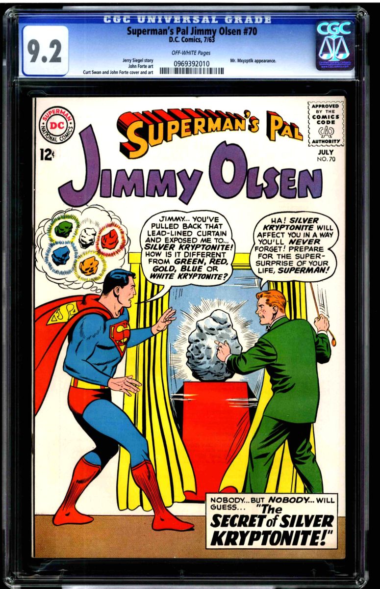 Superman's Pal Jimmy Olsen #70 CGC 9.2 off-white pages. Jerry Siegel story, John Forte art. Curt Swan and John Forte cover and art. Mr Mxyzptlk appearance. Overstreet 2009 NM 9.2 value = $95. CGC census: 1 at 9.2, 3 higher.