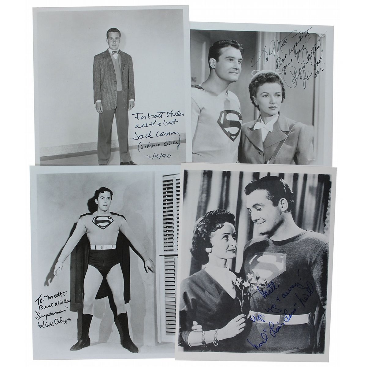 Four photos of various finishes, 8 x 10 and 10 x 8, each signed and inscribed in felt tip by the Superman actor pictured. Signers are: Kirk Alyn, Jack Larson, Noel Neill, and Phyllis Coates. In overall fine condition.