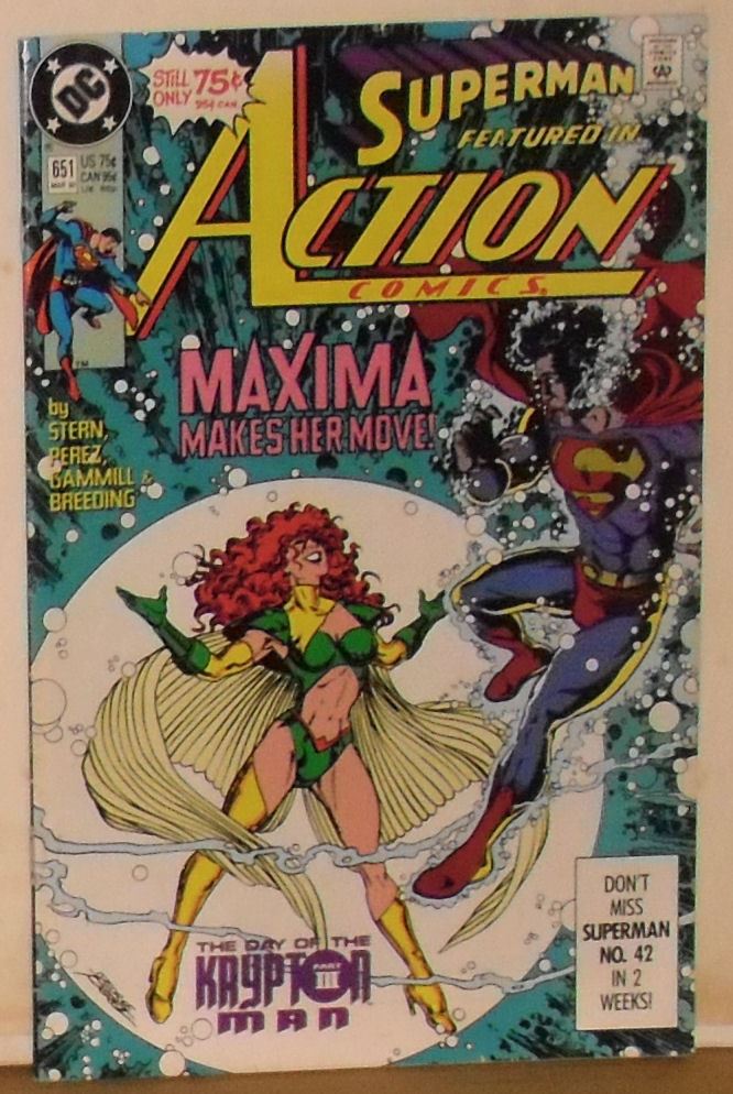 Super hero Superman #651, 1990 was still incredibly only 75 cents then, Superman DC Action Comics; Printed in U.S.A. is this one, "Maxima Makes Her Move" with such great cover page also noted: "The Day of the Krypton Man"; as is surely looks mint being not read yet this collectible vintage comic book); great for your collection or start one now !