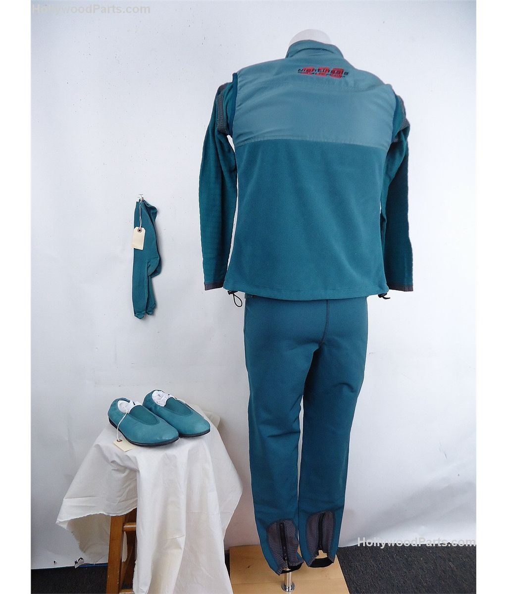 Futuristic space uniform worn by Robert Forster as A.J. Marley in Supernova. Costume consists of teal fleece/nylon sleeveless zipper front jacket, Nightingale logo embroidered at left chest, "229/Nightingale Soma USA Corporation" embroidered on back; teal ribbed stretch sleeveless V-neck shirt; teal stretch pants; teal leather stretch fabric slippers with black rubber sole and teal stockings.